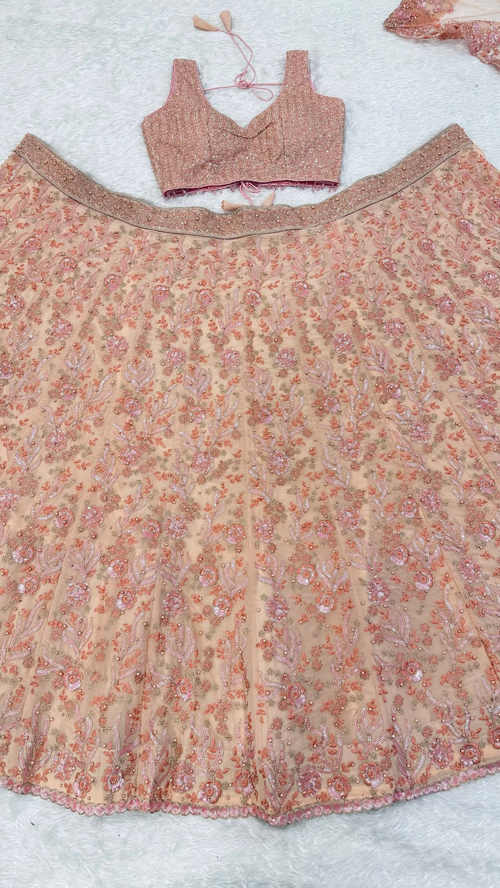 Grace meets grandeur in this exquisite georgette lehenga set, richly detailed with sequins, pearls, and dori work – perfect for weddings, sangeet, and festive celebrations.
