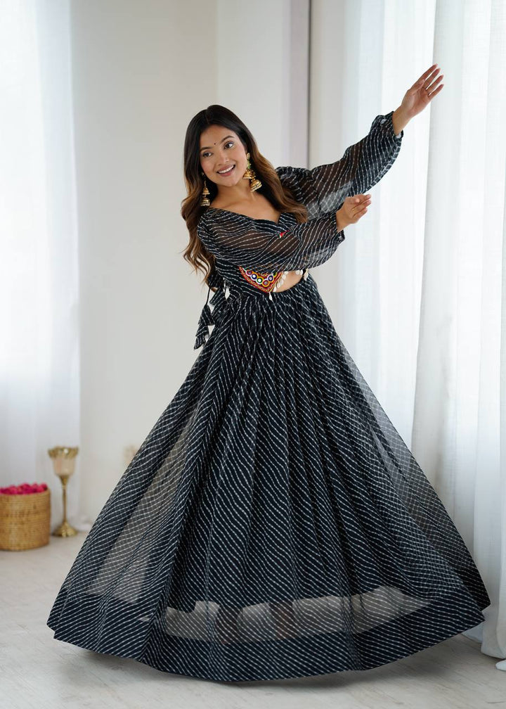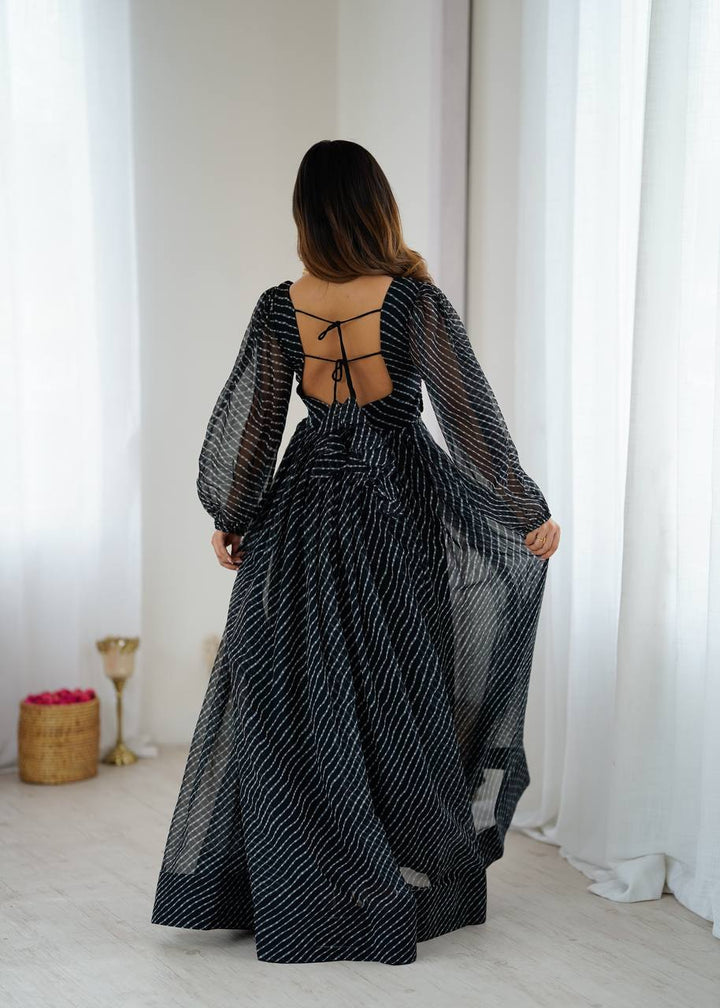 Stylish georgette gown with digital print, chain-stitch embroidery, balloon sleeves, and tassel details. Ready-to-wear in multiple sizes with a 4-meter flair.