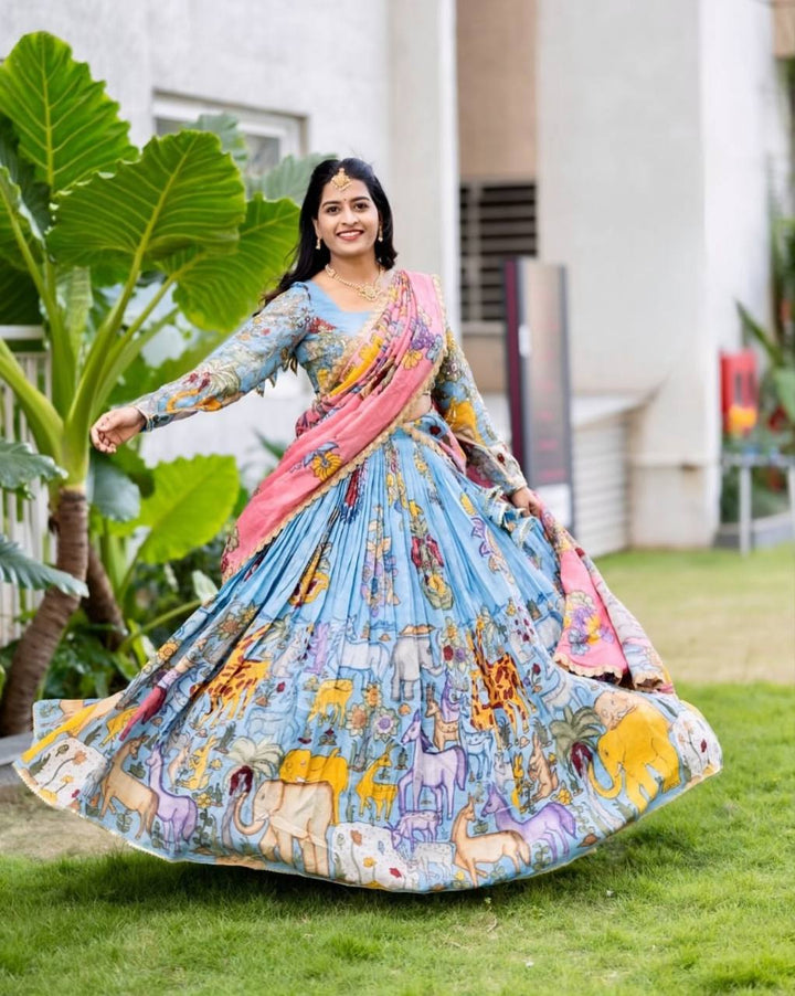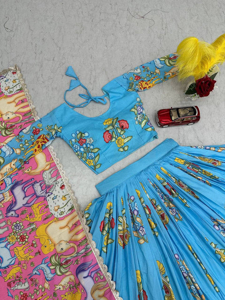 A beautiful traditional lehenga set crafted in soft, breathable cotton with elegant Kalamkari print detailing. Fully stitched and designed for comfort, everyday ethnic wear, festive gatherings, and cultural celebrations.