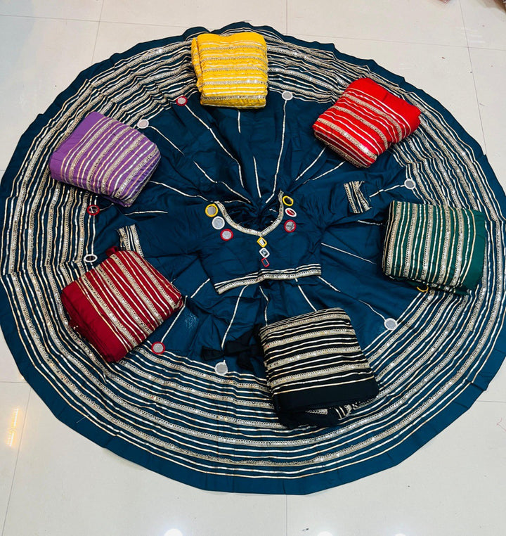 Celebrate Navratri in style with this Roman silk lehenga and blouse set, adorned with gota and lace work. Fully stitched, comfortable fit, and ready to wear