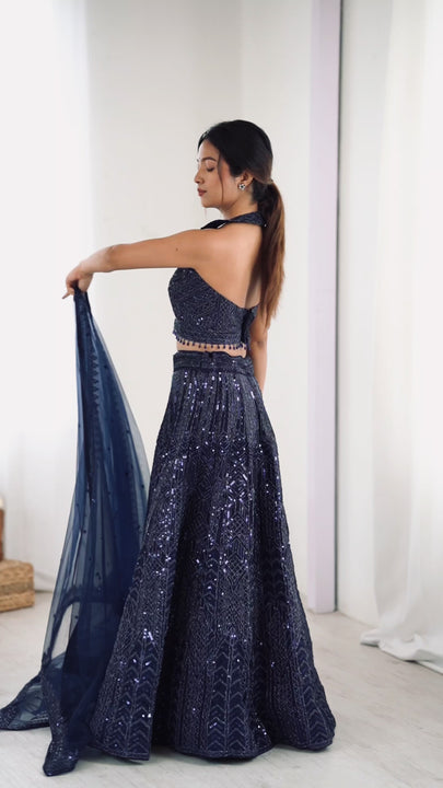 Blue Net Lehenga Set with Sequins & Dori Embroidery