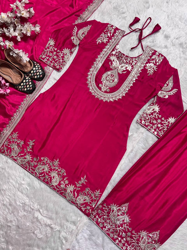 Elevate your ethnic wardrobe with this stunning Suit Set, crafted from luxurious Chinnon Silk and adorned with exquisite embroidery and sequin detailing for a regal look.