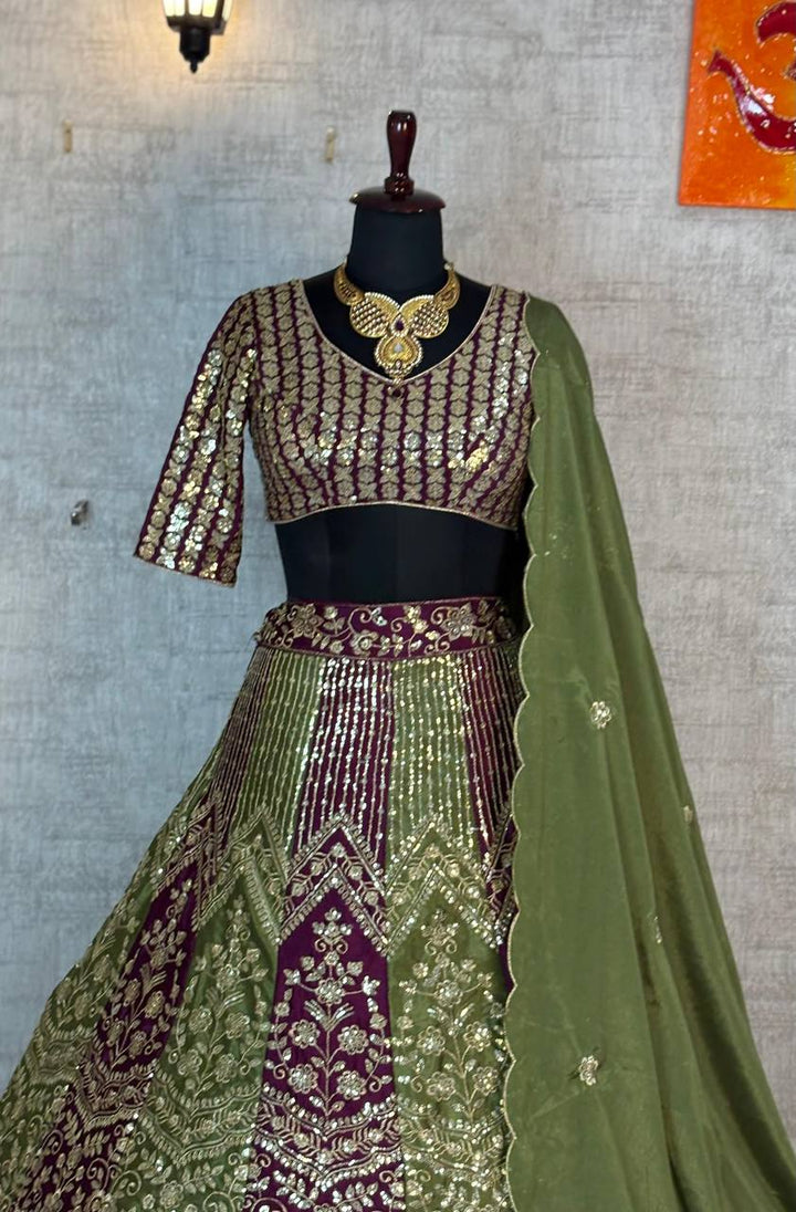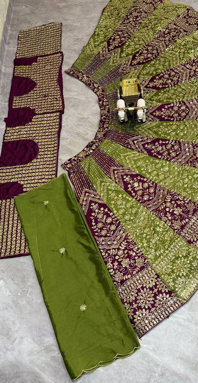 Elegant semi-stitched chinon silk lehenga with sequins embroidery, paired with a matching blouse and dupatta. A perfect choice for weddings, receptions, and festive occasions.
