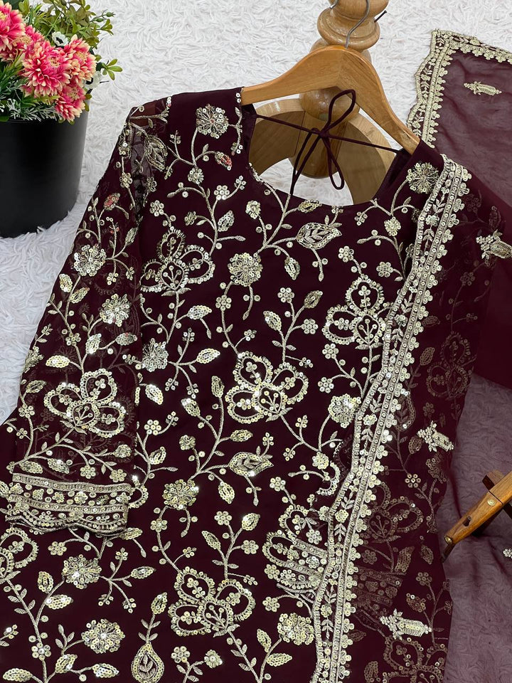Coffee Faux Georgette Embroidered Sharara Suit Set
