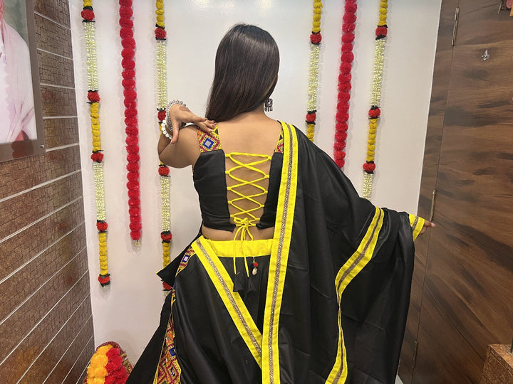 Work: Gamthi lace combined with delicate mirror work for festive elegance