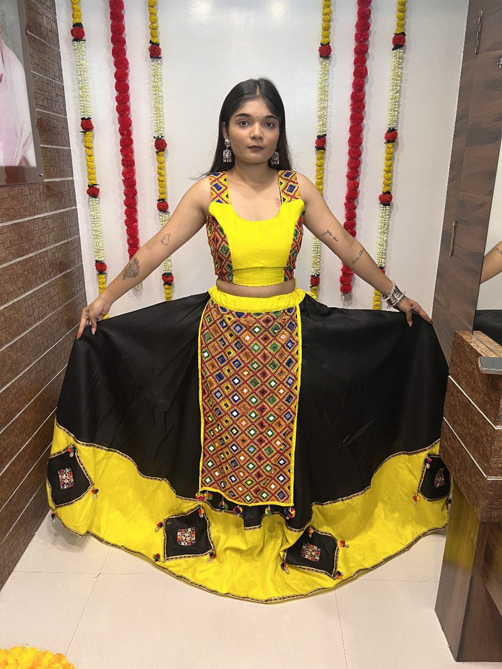 Celebrate tradition in style with this beautifully crafted lehenga choli set. Designed with rich fabrics and detailed Gamthi artistry, it offers both grace and comfort. The 6-meter flair ensures a flowing silhouette, making it a perfect choice for festive occasions, weddings, and Navratri celebrations.