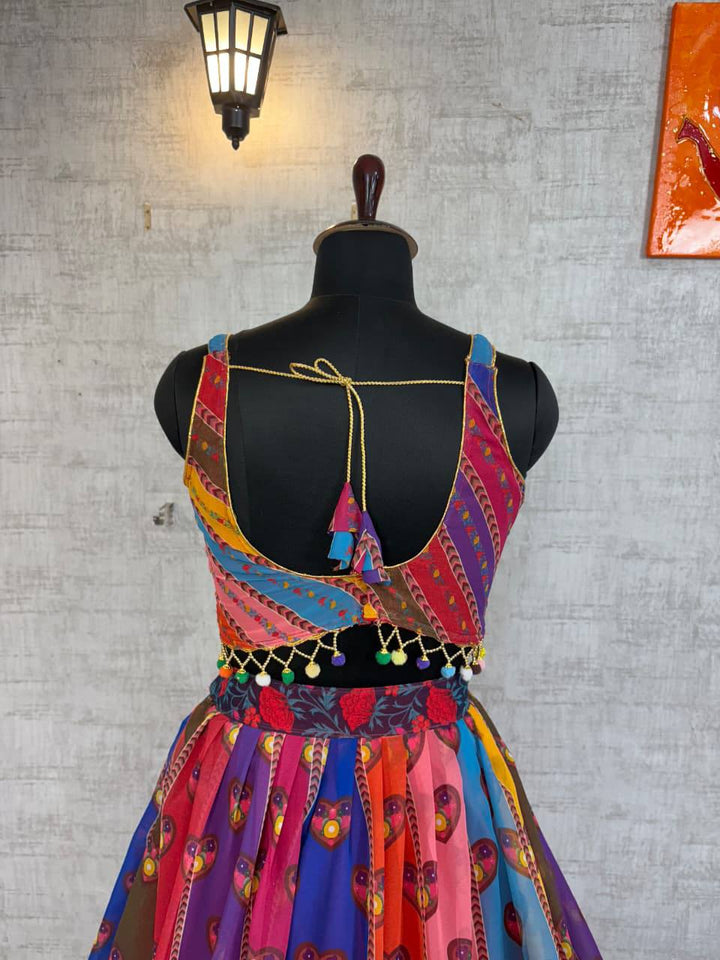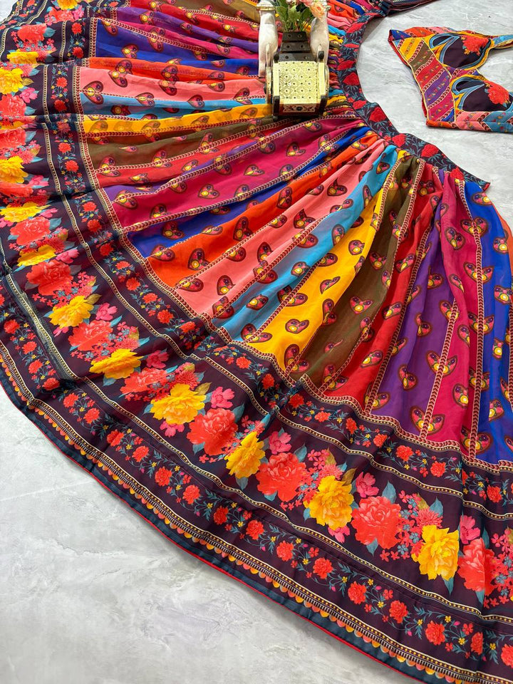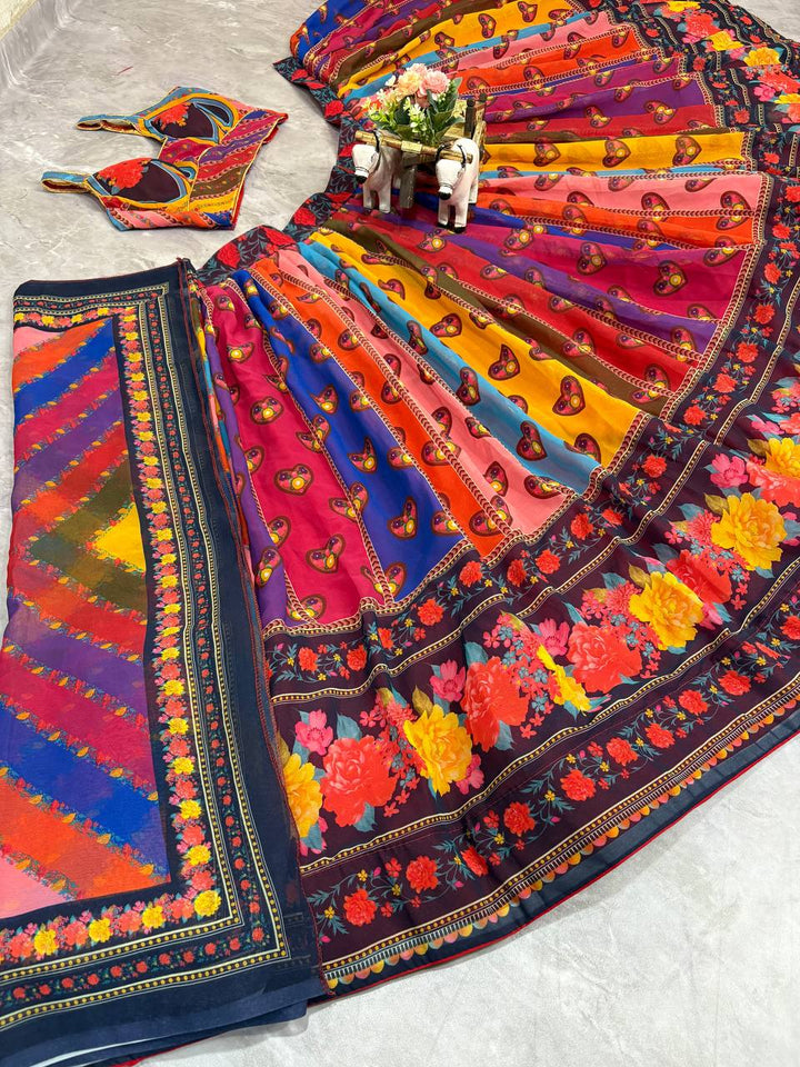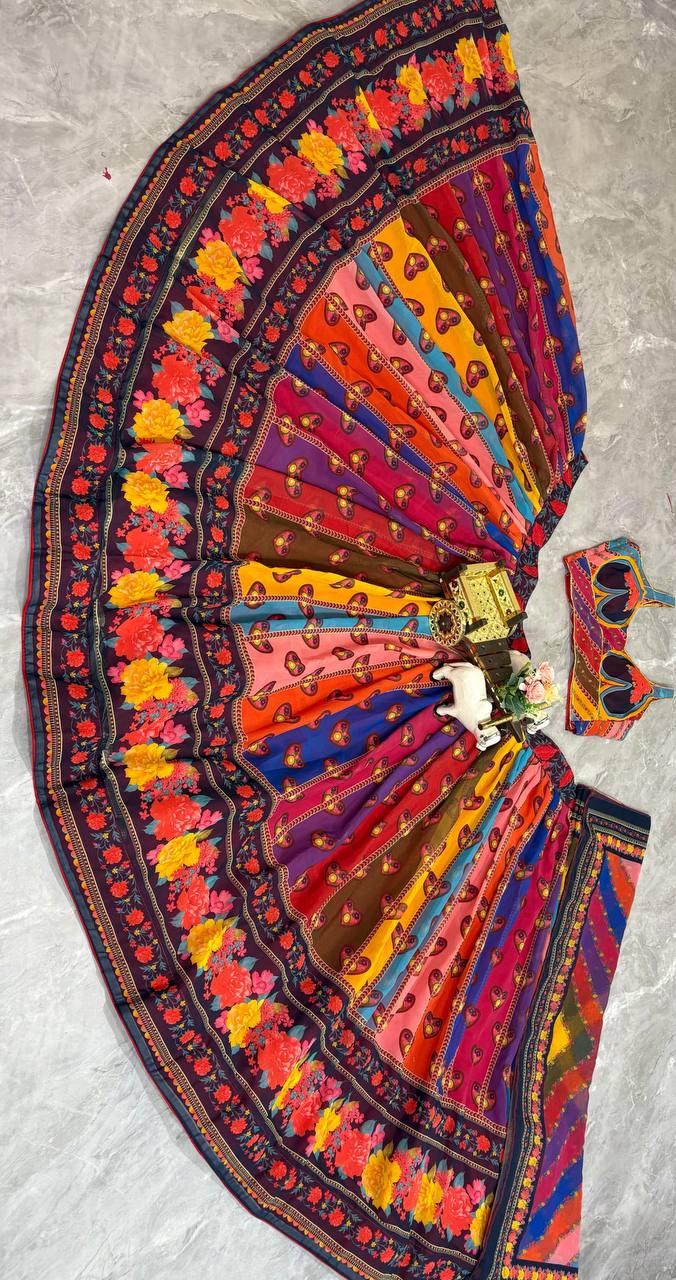 Elegant fox georgette lehenga with digital print work, matching blouse, and dupatta. Semi-stitched, lightweight, and perfect for weddings or festive occasions. Elevate your ethnic look with our Designer Lehenga Choli Set, crafted in premium fox georgette with beautiful digital prints. This outfit is designed to give you effortless elegance for weddings, festivals, and special events.