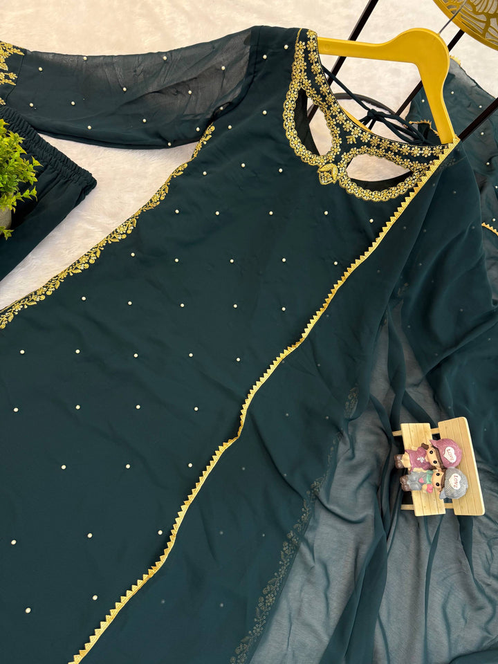 Step into timeless elegance with our MST-1125 3-piece set, a masterpiece crafted in luxurious faux georgette and adorned with intricate embroidery and real pearl moti work. Designed to blend sophistication with comfort, this outfit is perfect for festive occasions, parties, or elegant gatherings.