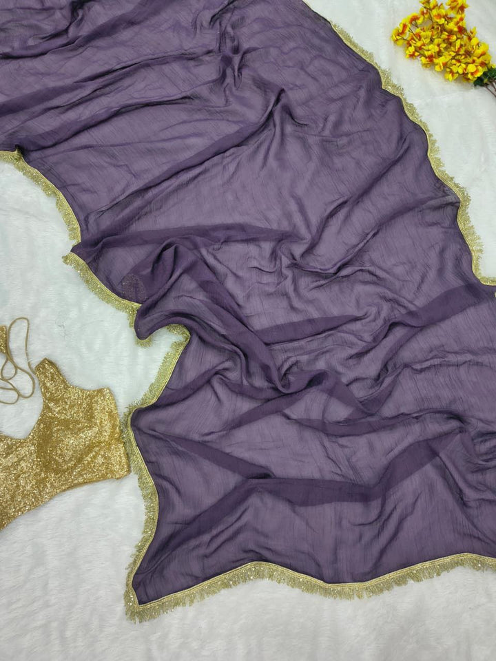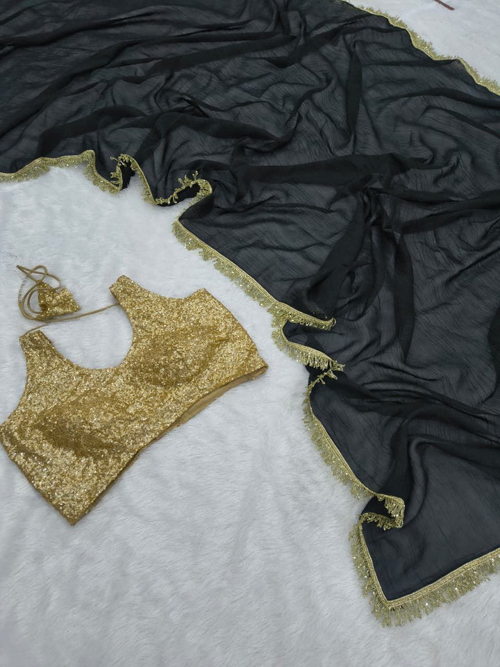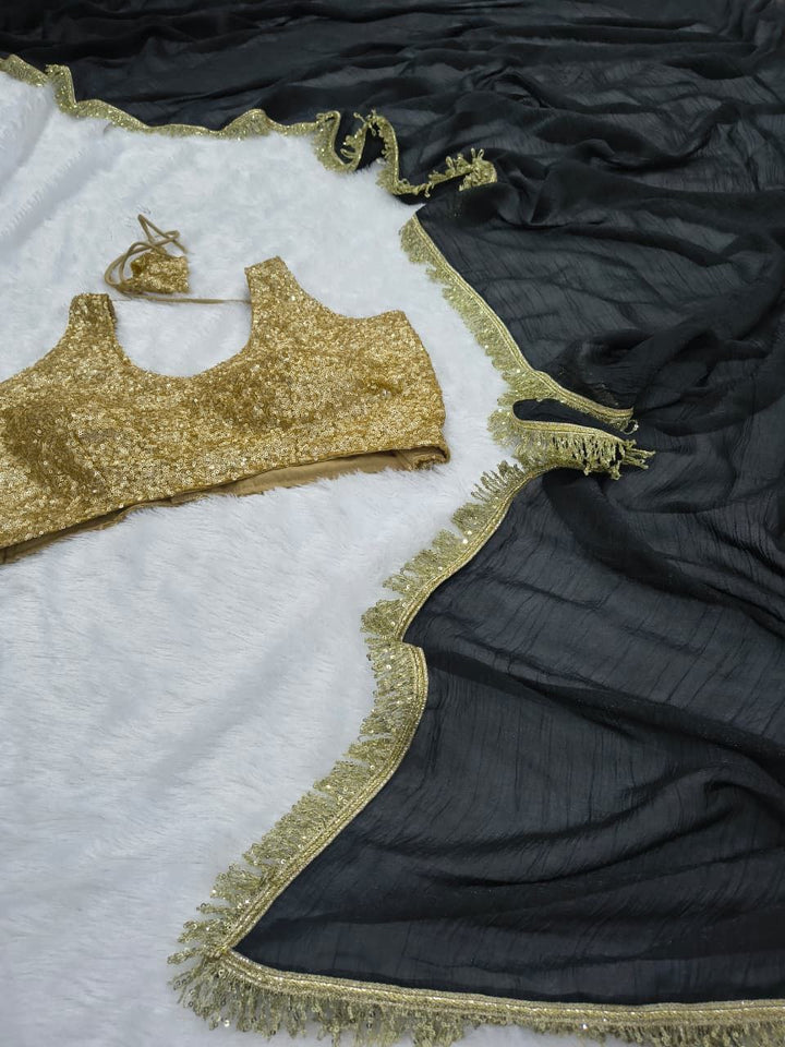 Drape yourself in timeless elegance with this Premium Gold Crush Saree, designed to make you shine at every occasion. Crafted from luxurious gold crush fabric, this saree is beautifully adorned with heavy sequin embellishments and a designer lace border, giving it a regal and graceful appeal.