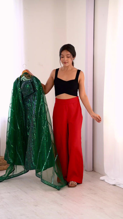 Step into the spotlight with this dazzling net lehenga adorned with rainbow sequins and intricate dori work. Designed for festive and party occasions, it features a graceful 3.5-meter flair with optional can-can for added volume. Paired with a matching net blouse and dupatta, both detailed with rainbow sequins and dori work, this outfit brings glamour and elegance to any celebration.