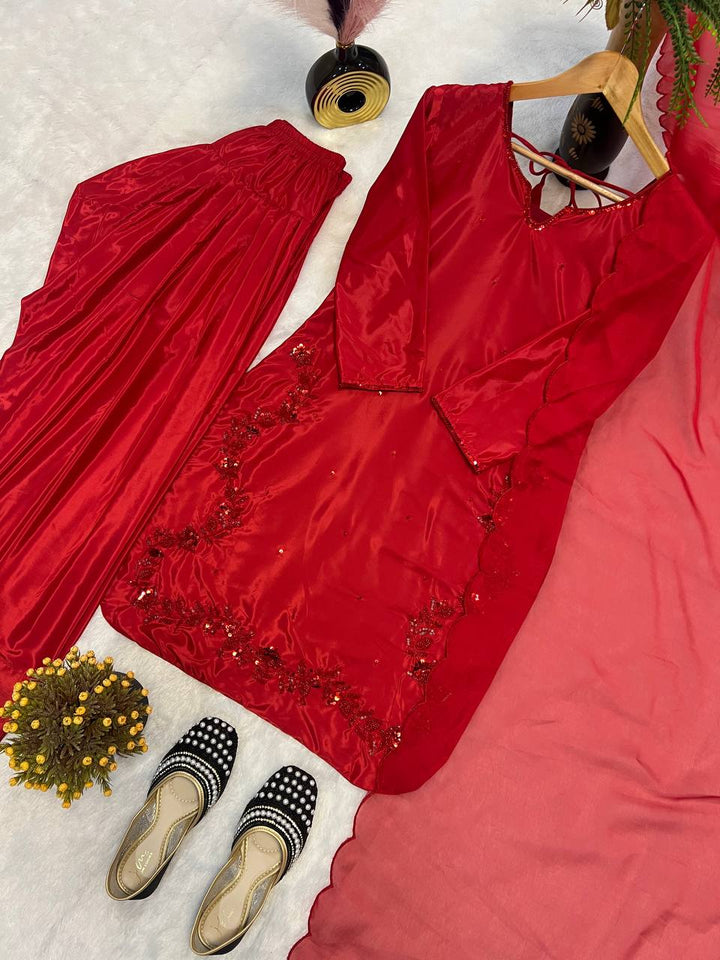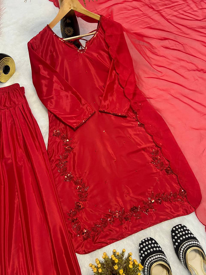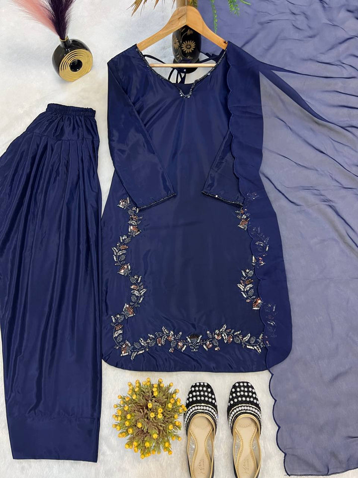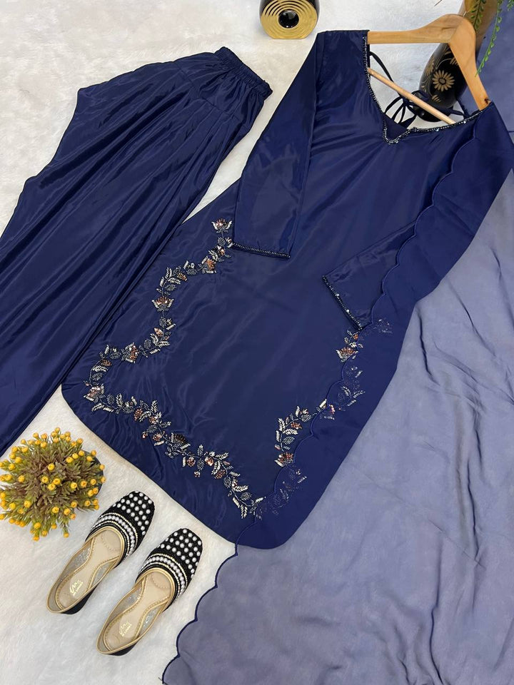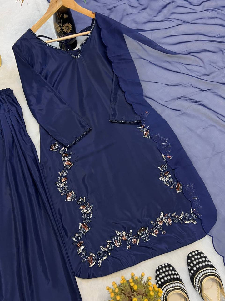 Elegant 3-piece Farshi Salwar set crafted from premium natural crepe silk with intricate hand embroidery, perfect for festive and wedding occasions.