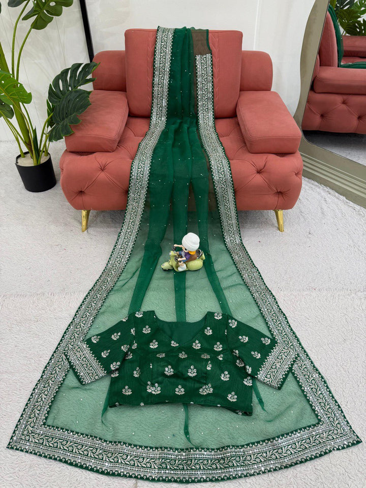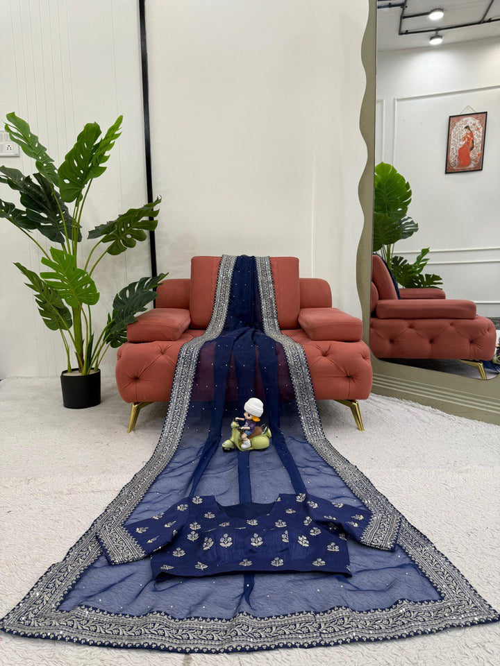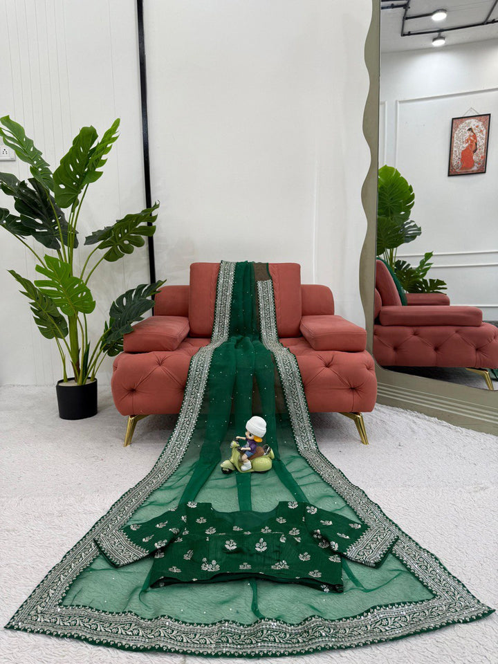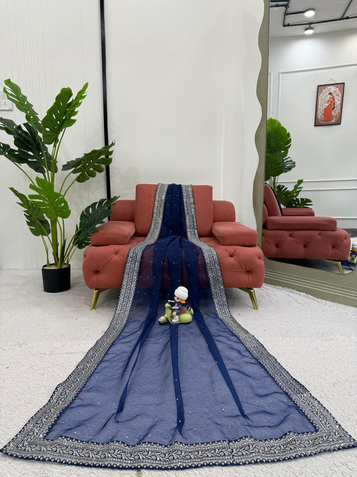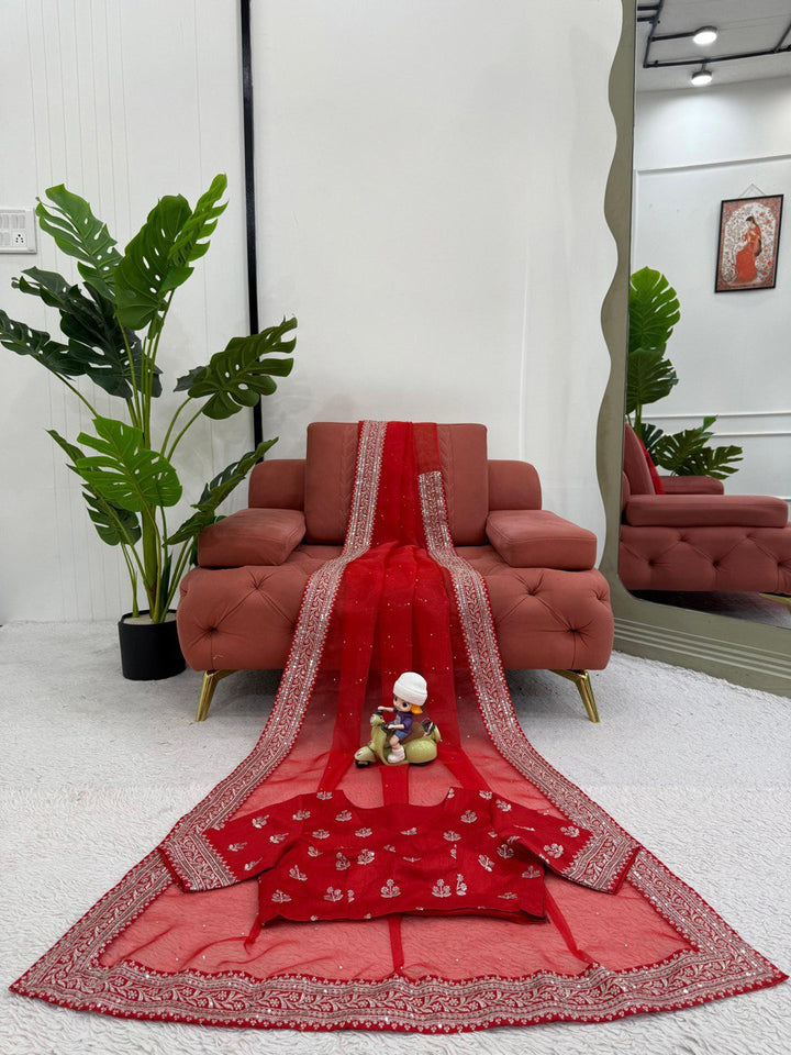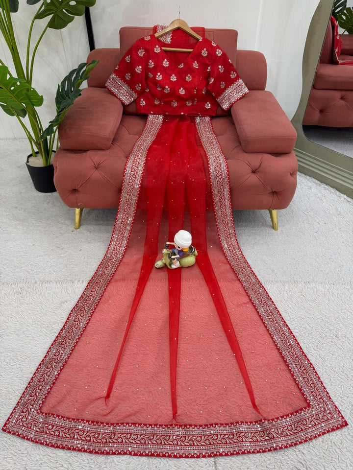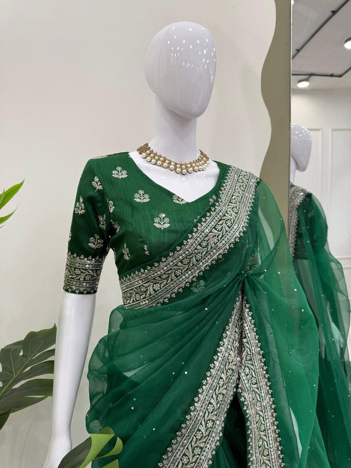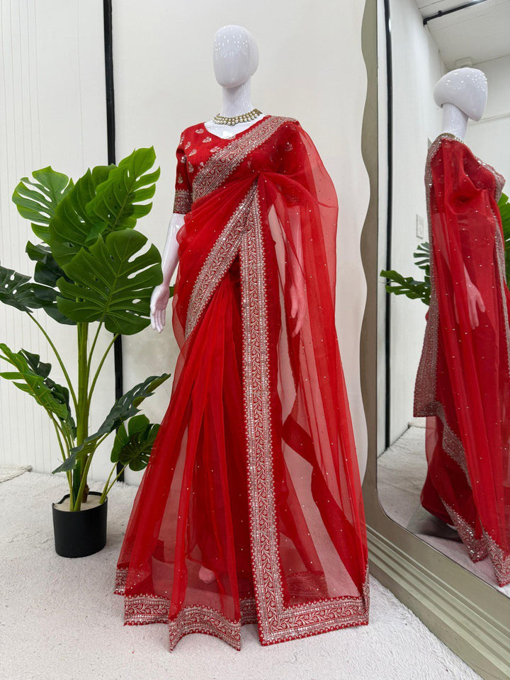 This beautiful designer saree is crafted in premium Heavy Organza Silk, featuring intricate thread and sequin work with LCD diamond embellishments across the entire saree. The blouse is made from Mono Benglori Silk with matching thread, sequin, and lace work, allowing for a perfectly coordinated and elegant look.