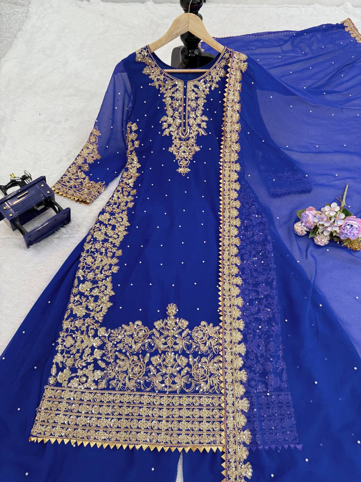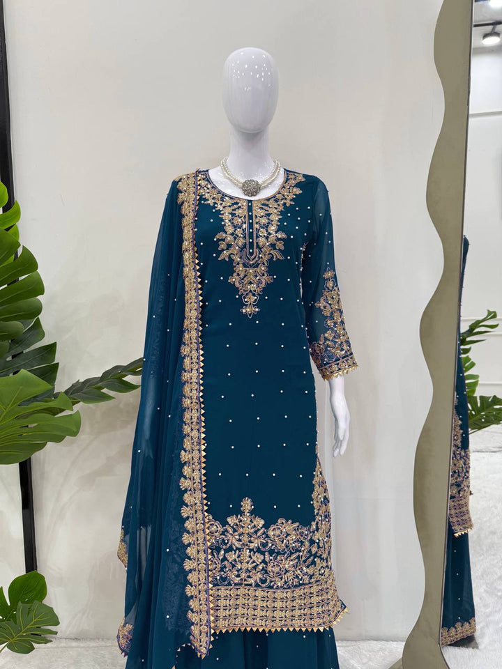 Add timeless elegance to your festive wardrobe with this Faux Georgette Sharara Suit Set with Dupatta, featuring intricate coding embroidery, sequin work, and rivet moti detailing. This fully stitched set is perfect for weddings, parties, and festive gatherings, offering a graceful silhouette with effortless comfort.