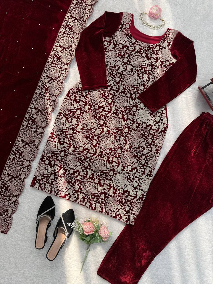 Maroon Viscose Velvet Top, Pant & Dupatta Set