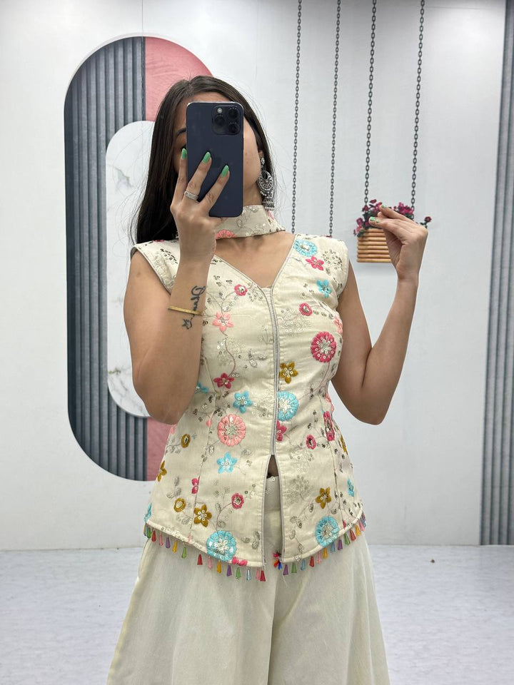 Step into a world of glimmering sophistication with this exquisitely crafted Pure Tissue Shimmer Plazzo Set. Designed for women who adore graceful silhouettes and luxurious fabrics, this ensemble blends traditional artistry with contemporary elegance. The shimmer-rich pure tissue fabric elevates your festive presence, while the heavy embroidered sequence work adds a radiant charm that catches the light beautifully.