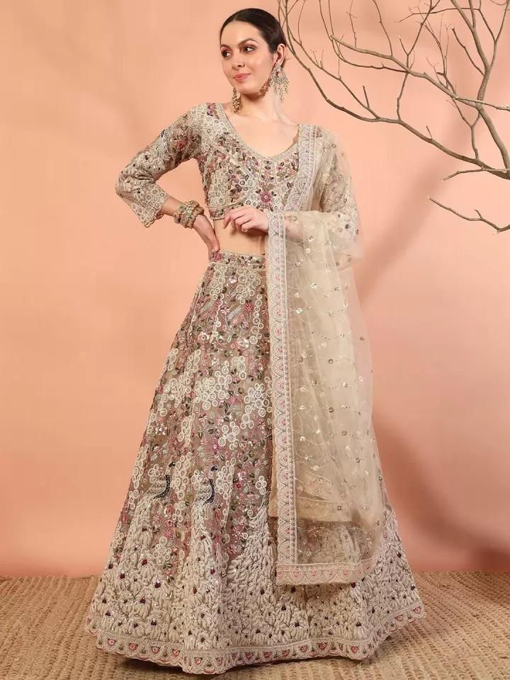 Elegant semi-stitched soft net lehenga with sequins embroidery, matching blouse, and dupatta. Perfect for weddings, receptions, and festive celebrations.