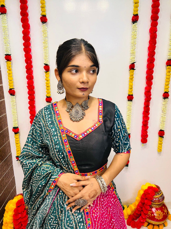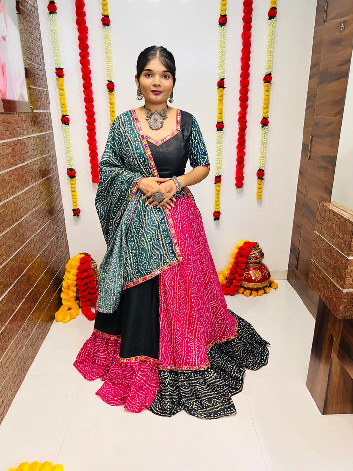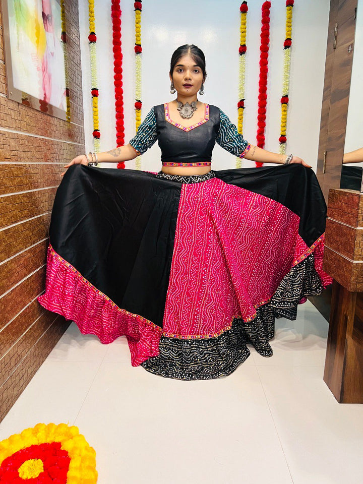Elegant Bandhani printed cotton silk lehenga set with 6-meter flair, gamthi lace mirror work blouse, and matching cotton dupatta.