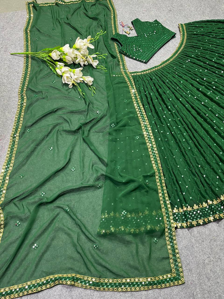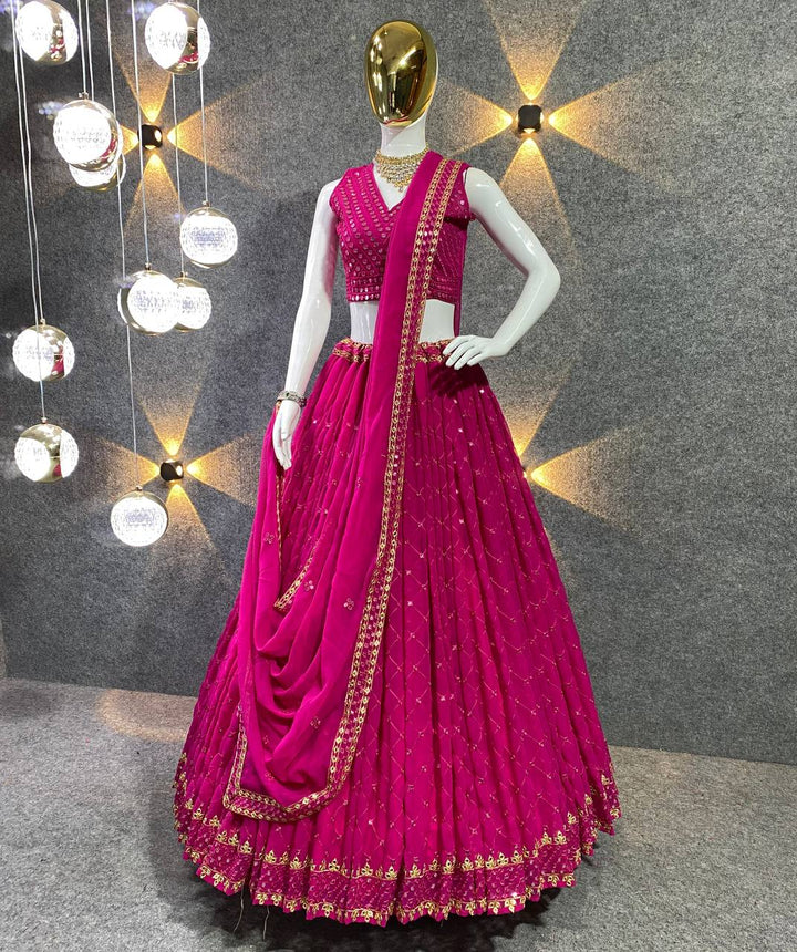 Elegant and festive, this silk lehenga choli set features intricate embroidery, sequin, and zari work. Perfect for weddings, parties, and traditional celebrations, it comes with a flared lehenga, matching blouse, and heavy dupatta.