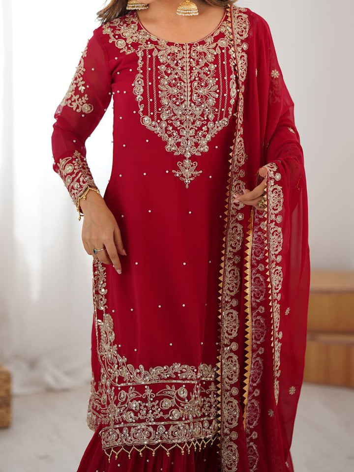 Stunning 3-piece sharara set in premium faux georgette, featuring designer cording dori embroidery, sequins, thread, and pearl detailing. Perfect for festive occasions and weddings.
