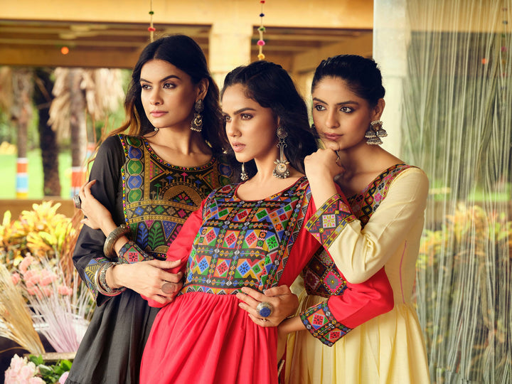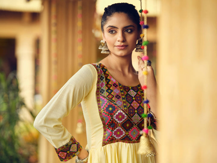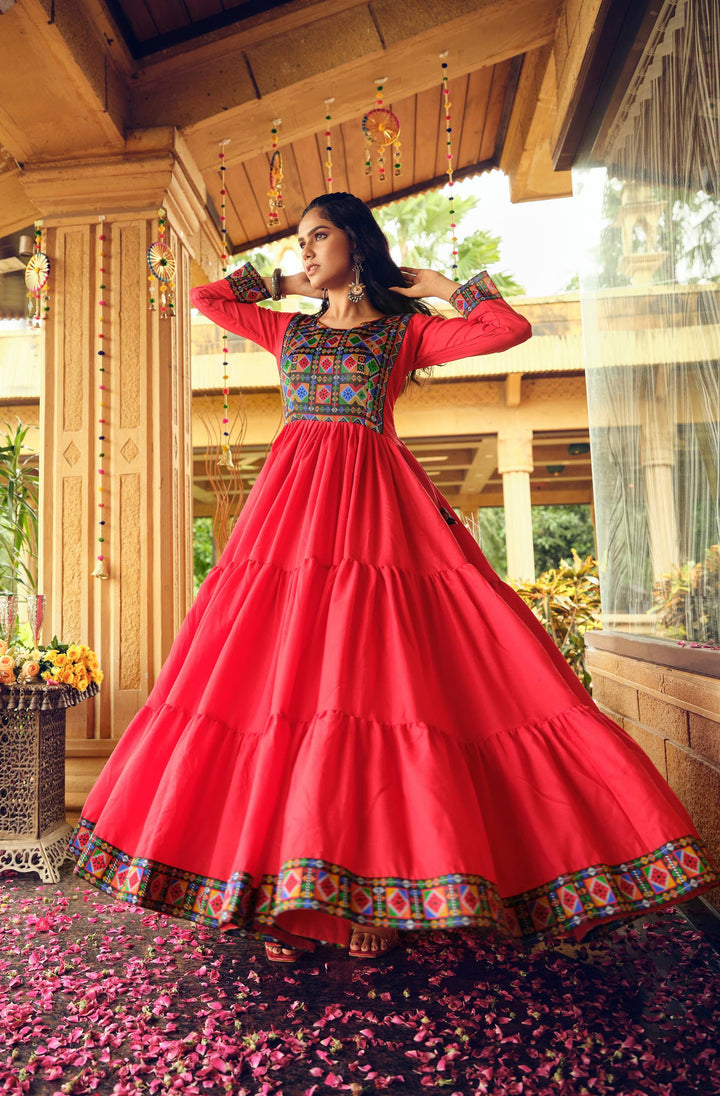 Elegant pure cotton gown with Gamthi jacquard weaving, lace border, and a stunning 7-meter 3-layer ruffle flair. Perfect festive and ethnic wear.