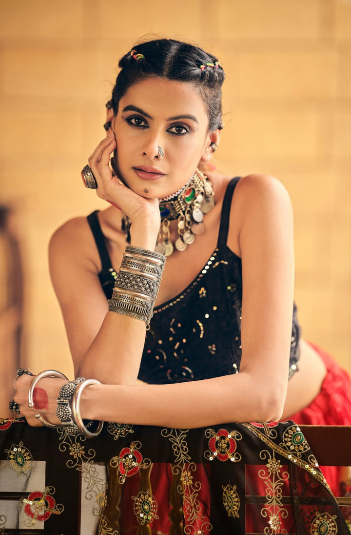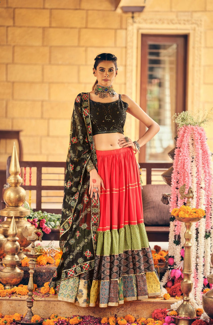 Elegant pure cotton printed lehenga with 4-layer ruffle flair, embroidered blouse, and georgette embroidered dupatta. Perfect for festive and ethnic wear.