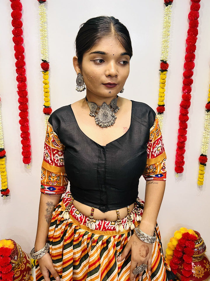 Beautiful pure cotton silk lehenga with 4-meter flair, gamthi butta & lace work, stitched blouse with mirror lace, and matching cotton dupatta.