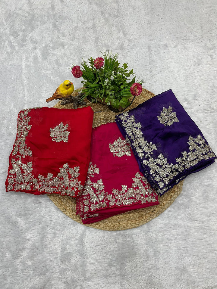 Introducing an elegant Pure Rangoli Silk Saree crafted with intricate traditional embroidery and premium finishing. This exquisite saree features a rich combination of jari dori, thread work, sequins, and jari embroidery, beautifully highlighted with a designer cutwork border. Available in three stunning colours, it is perfect for festive occasions, weddings, receptions, and cultural celebrations.