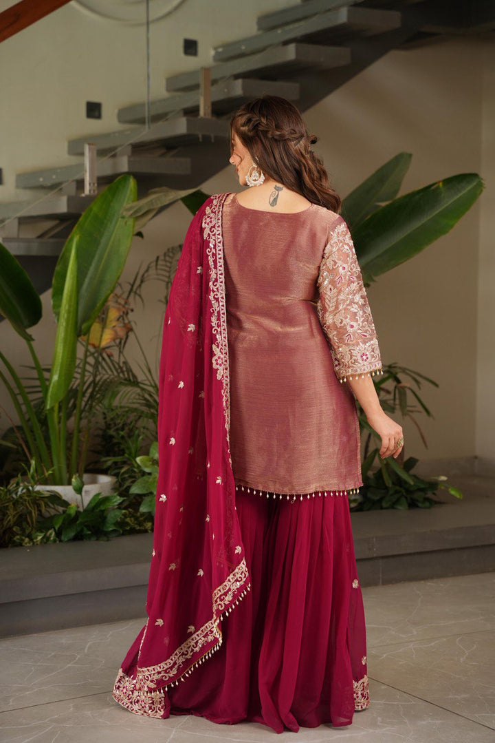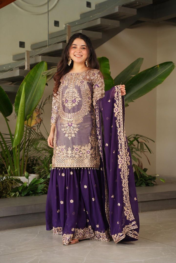 Purple & Pink Crazy Silk Embroidered Suit Set with Palazzo & Dupatta