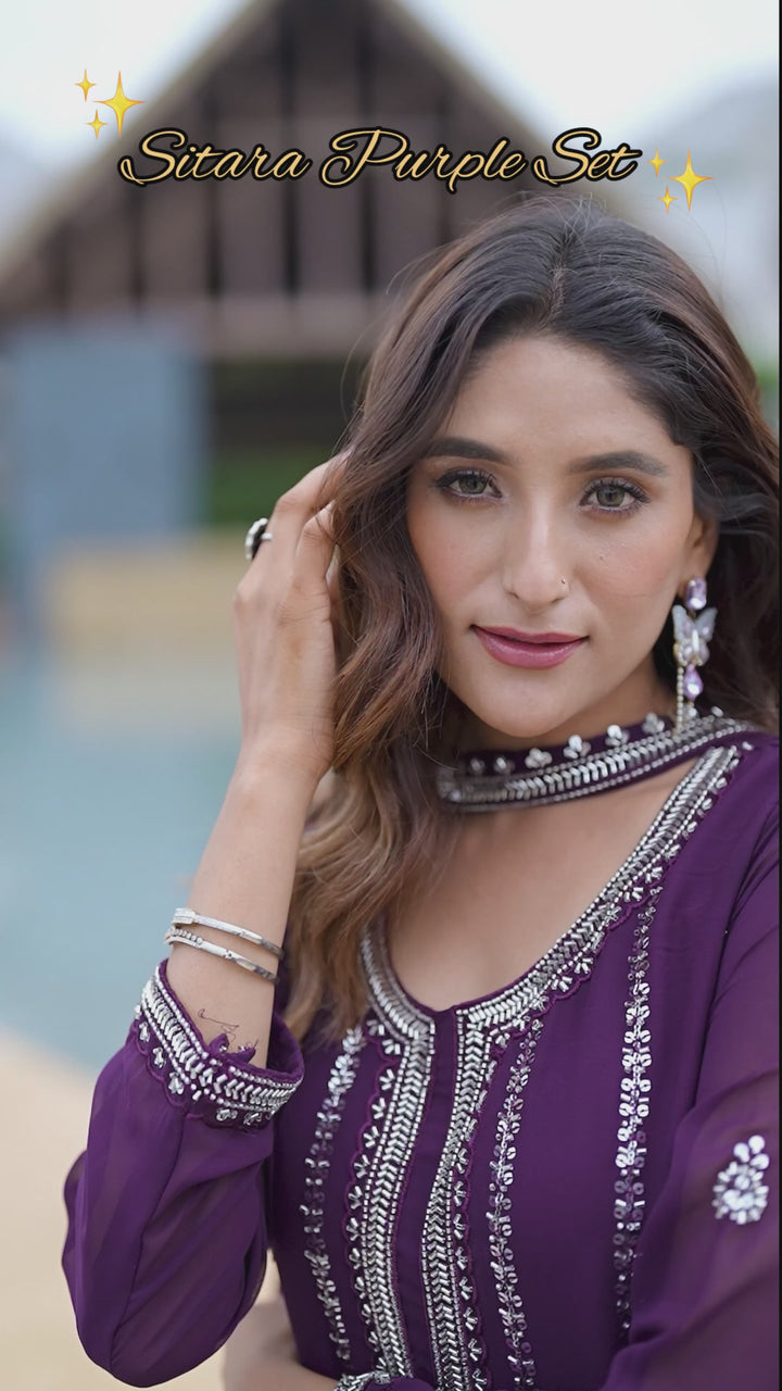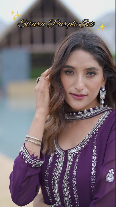 Elegant georgette sharara set with sequin embroidery and beadwork, paired with a stylish belt-style dupatta. Available in multiple sizes.