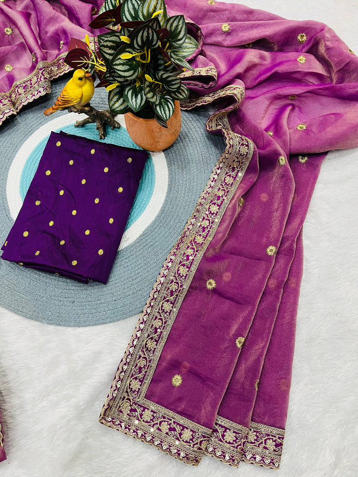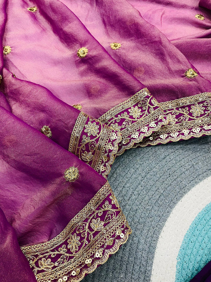 A premium Soft Mocha Silk saree crafted with rich sequins, cording work, zari butti motifs, and a fancy lace border. Paired with a beautifully woven Jacquard Silk blouse fabric featuring golden jari butti, this ensemble blends luxury with timeless elegance.