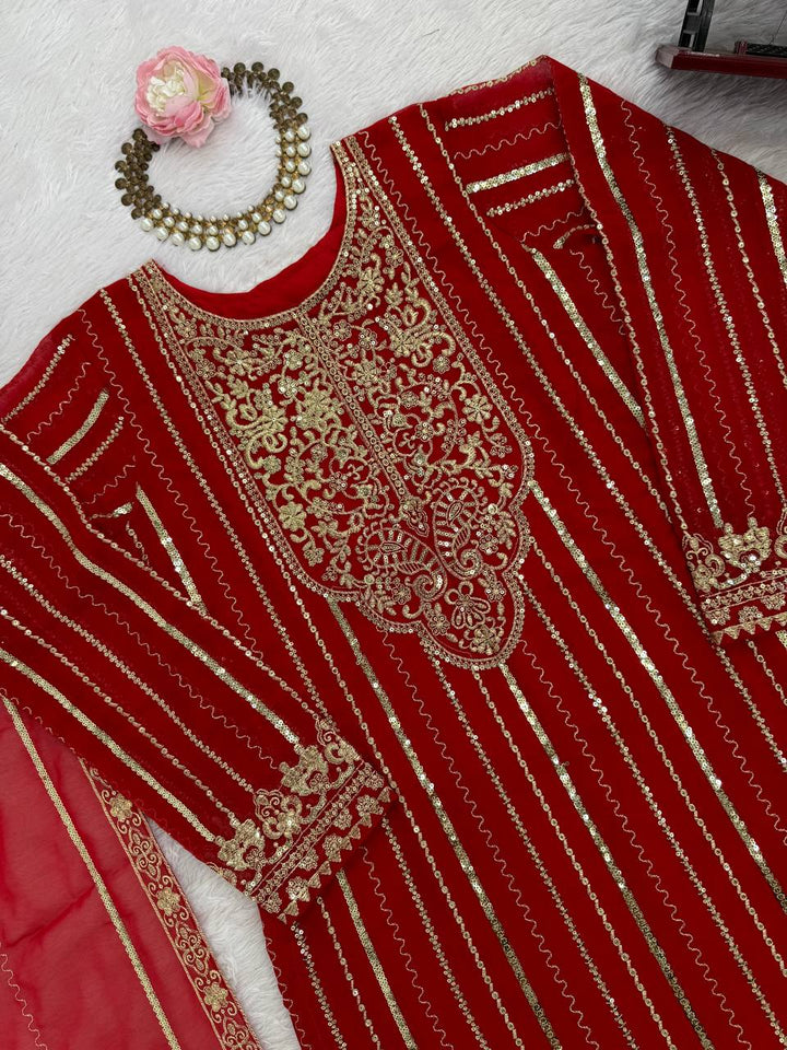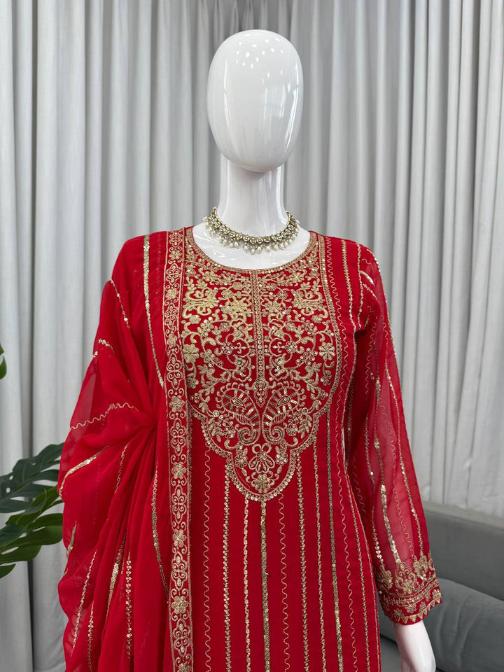 Red Faux Georgette Embroidered 3-Piece Suit with Dupatta