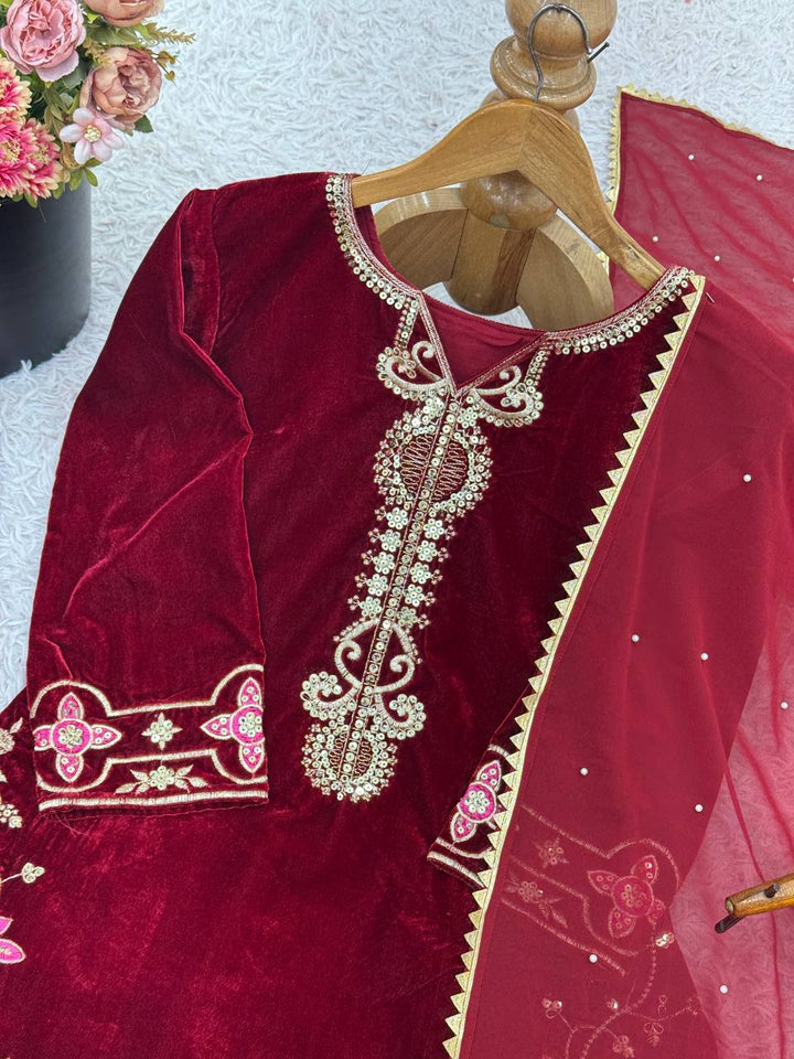 A premium, fully stitched velvet ensemble featuring rich embroidery, elegant detailing, and a graceful silhouette. Perfect for festive events, parties, and special occasions.