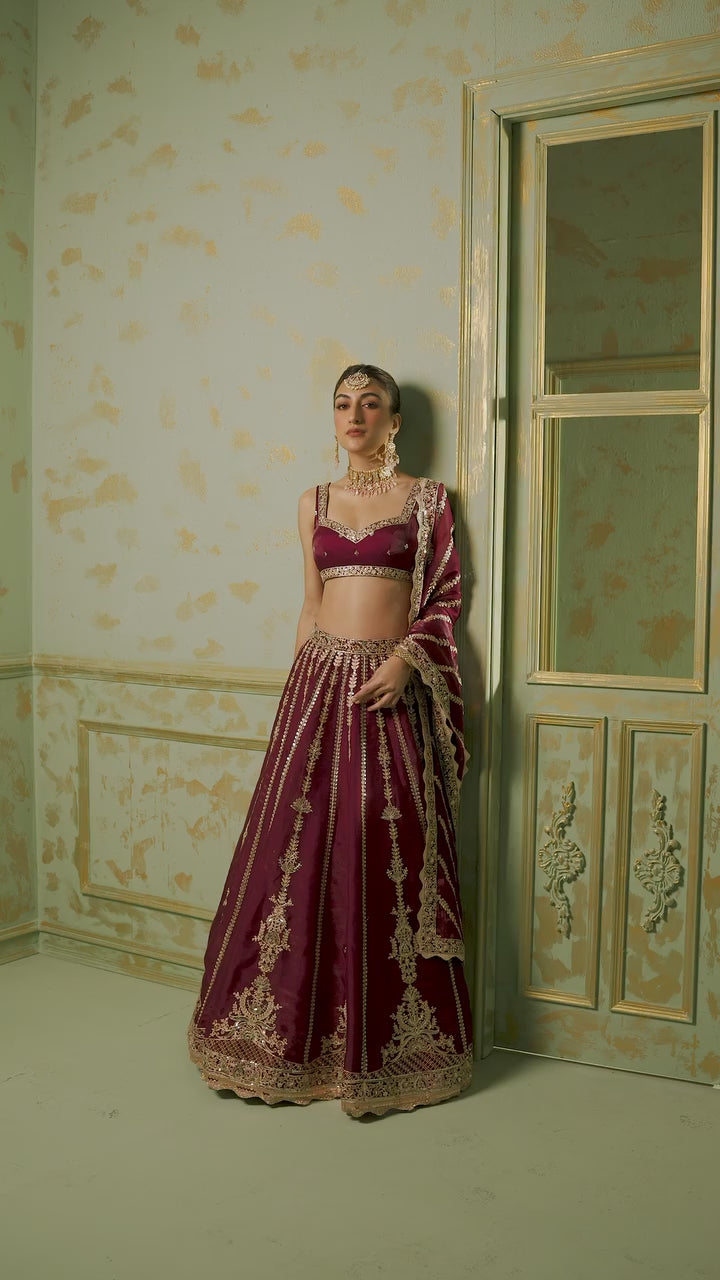 Step into elegance with this beautifully crafted Kasturi silk lehenga set, adorned with rich embroidery and sequins that make it perfect for weddings and festive occasions.