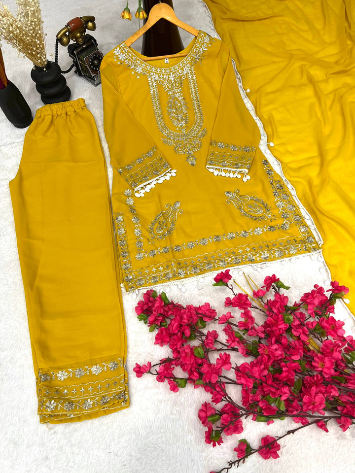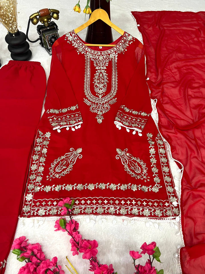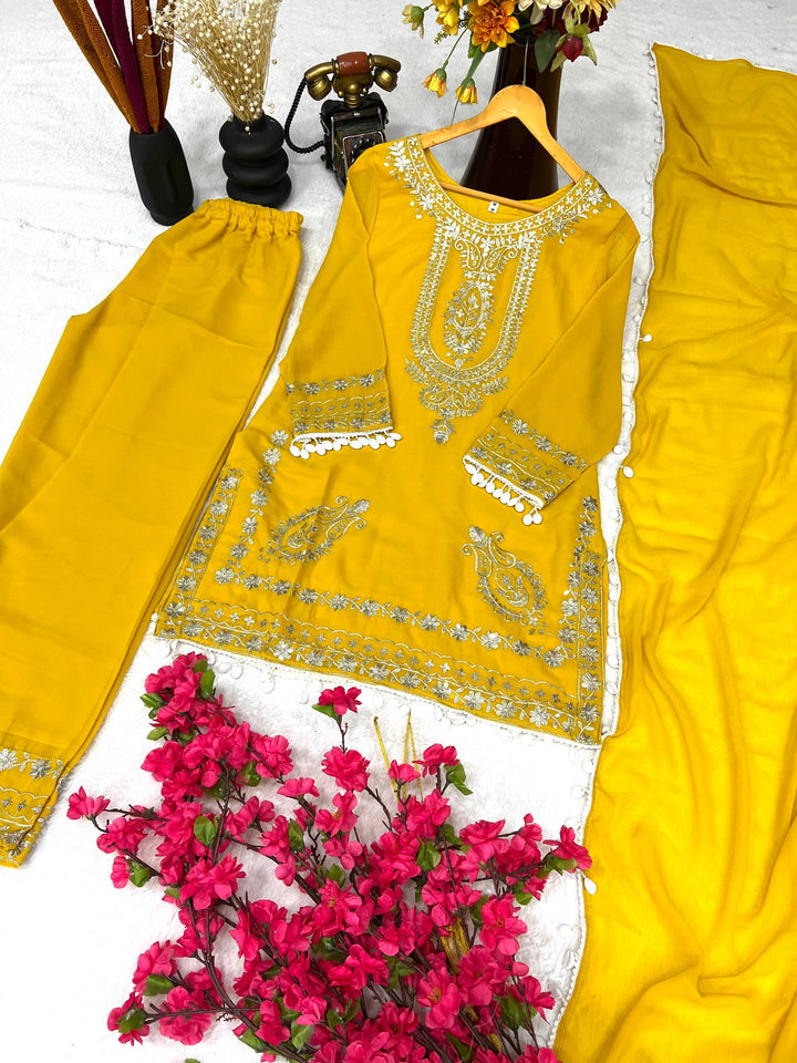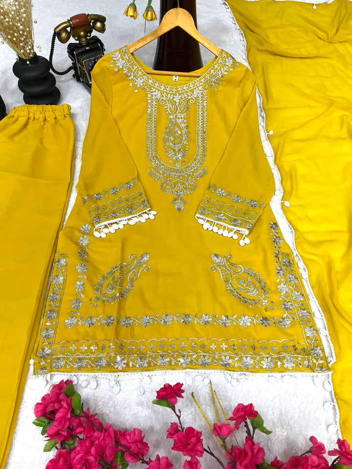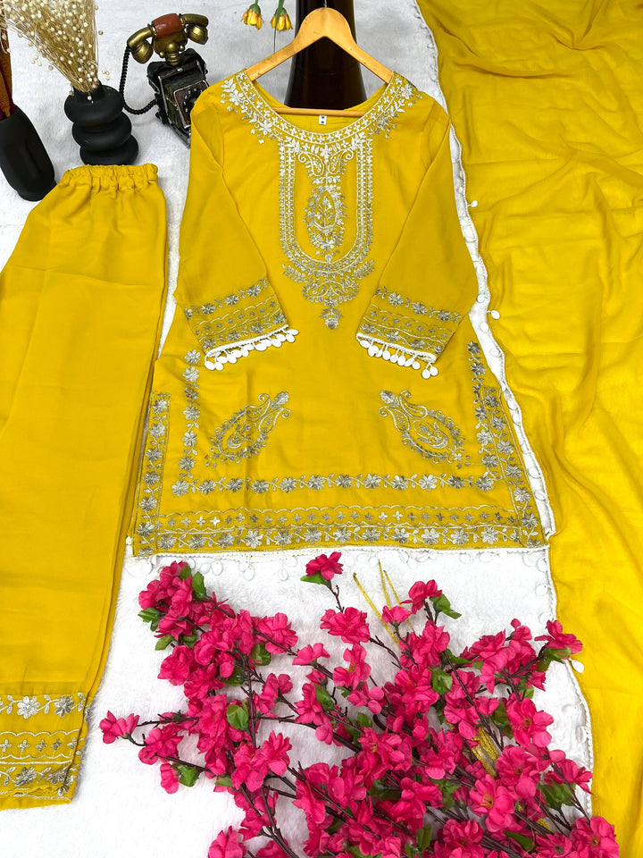 Elegant 3-piece kurti set in pure faux georgette silk with micro silk lining. Comes with a matching bottom and dupatta, beautifully detailed with multi-needle sequins embroidery and kodi lace.