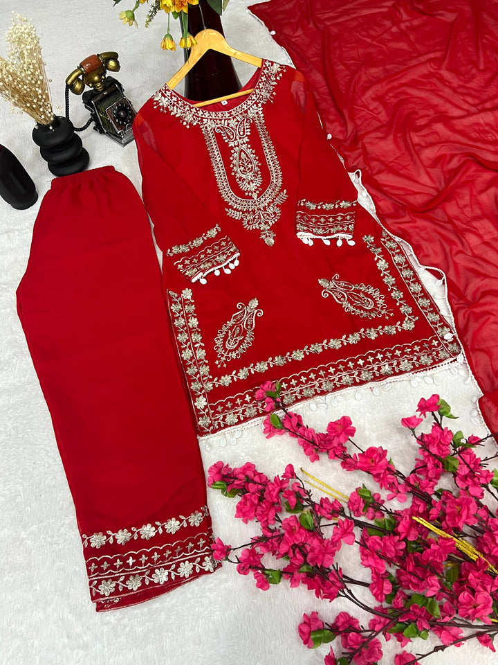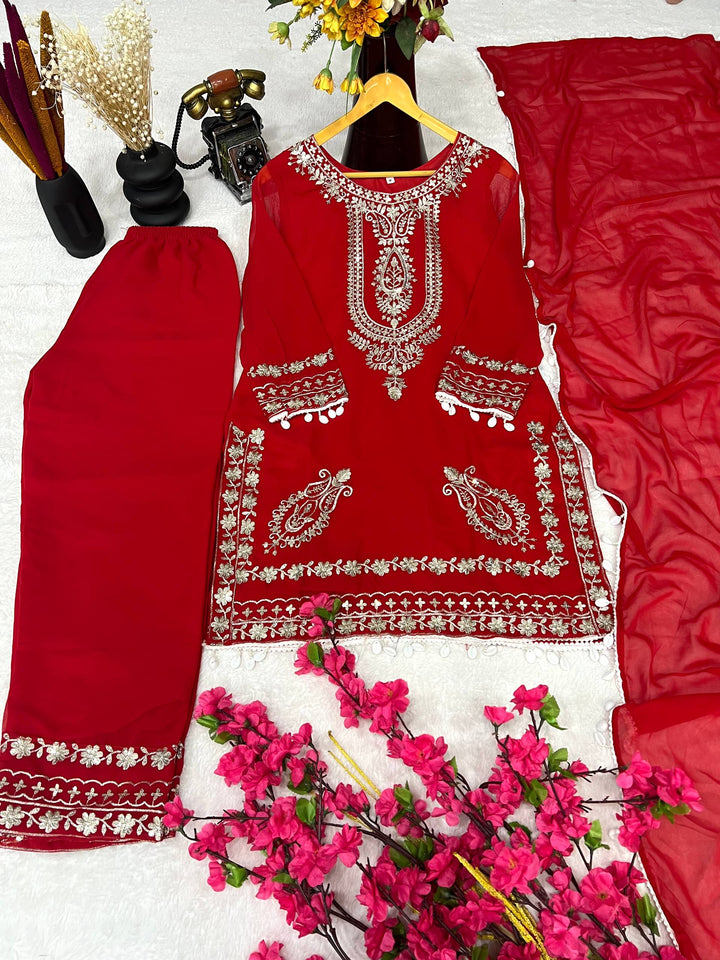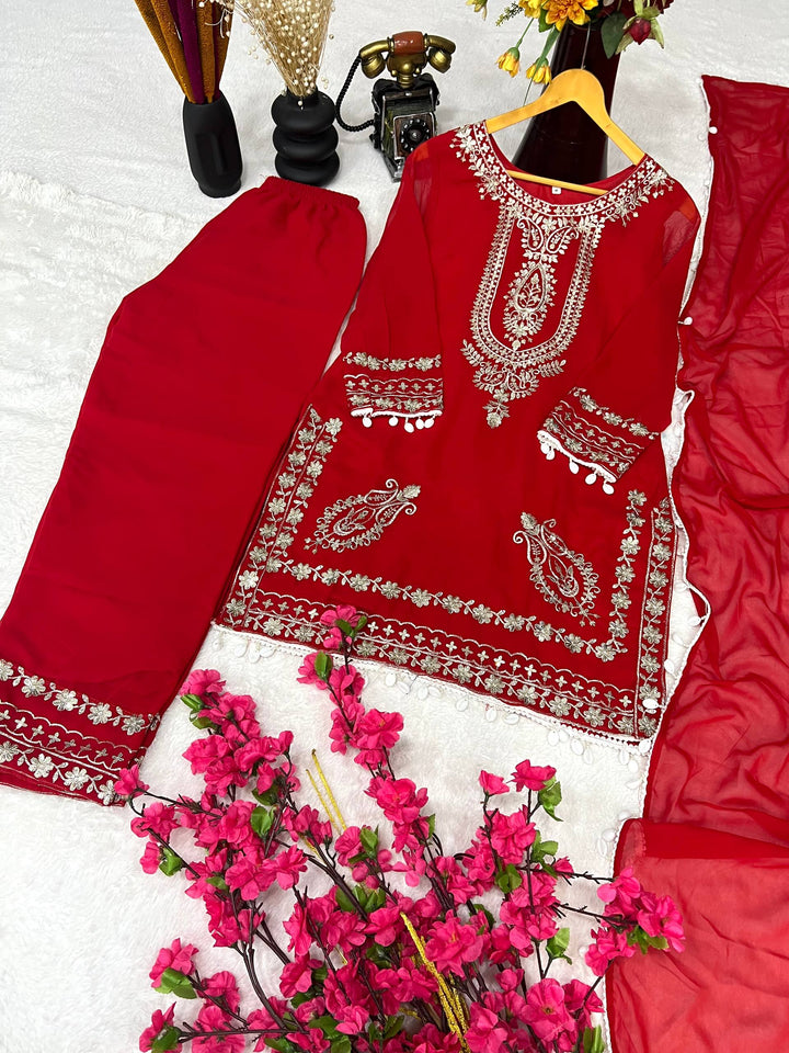 Red & Yellow 3-Piece Kurti Set with Sequins Embroidery & Dupatta