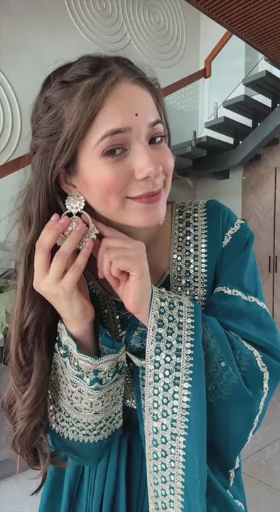 Step into elegance with this Fox Georgette Anarkali set, beautifully designed with heavy coding embroidery and sequin work. Featuring a soft micro cotton inner with cups and zipper for added comfort, this floor-length Anarkali is paired with a matching embroidered dupatta – perfect for weddings, parties, and festive occasions.
