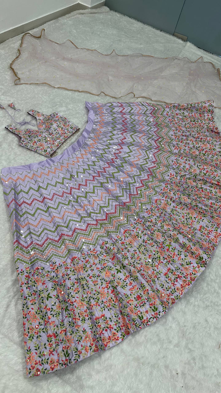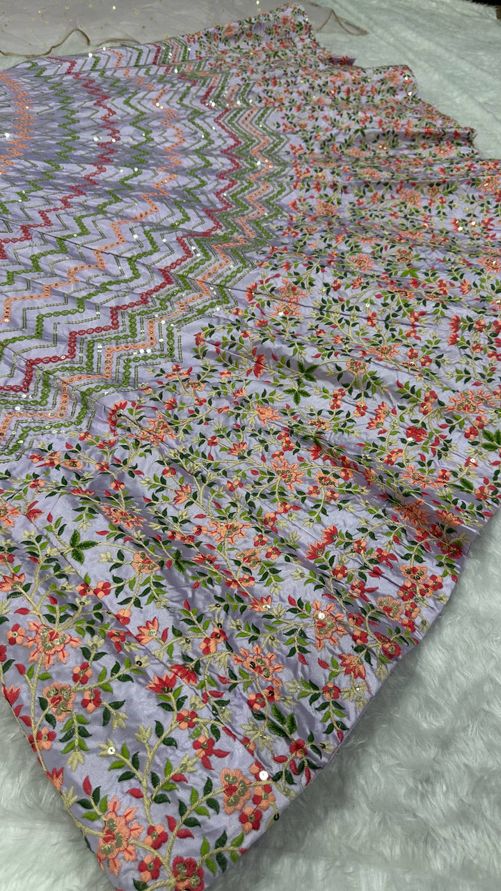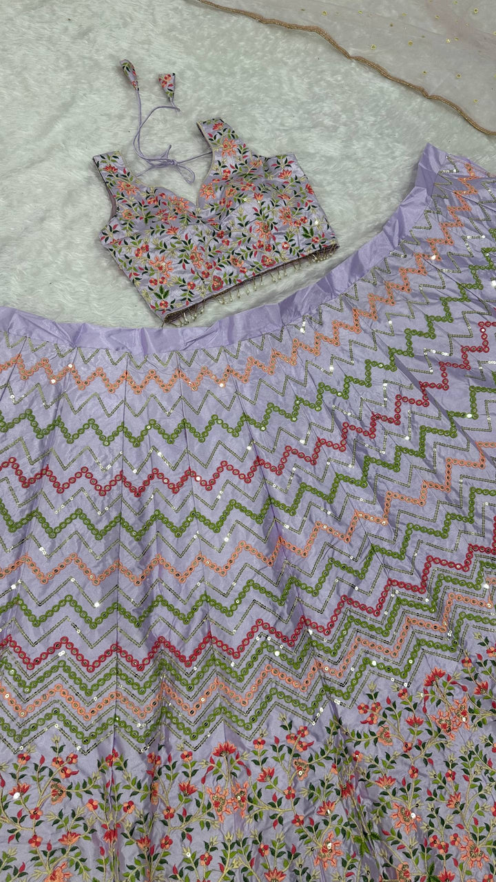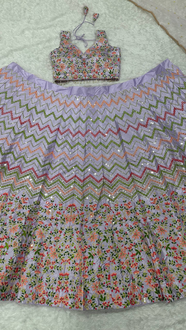Violet Heavy Satin Silk Lehenga with Sequins & Thread Work, Tassel Border Dupatta