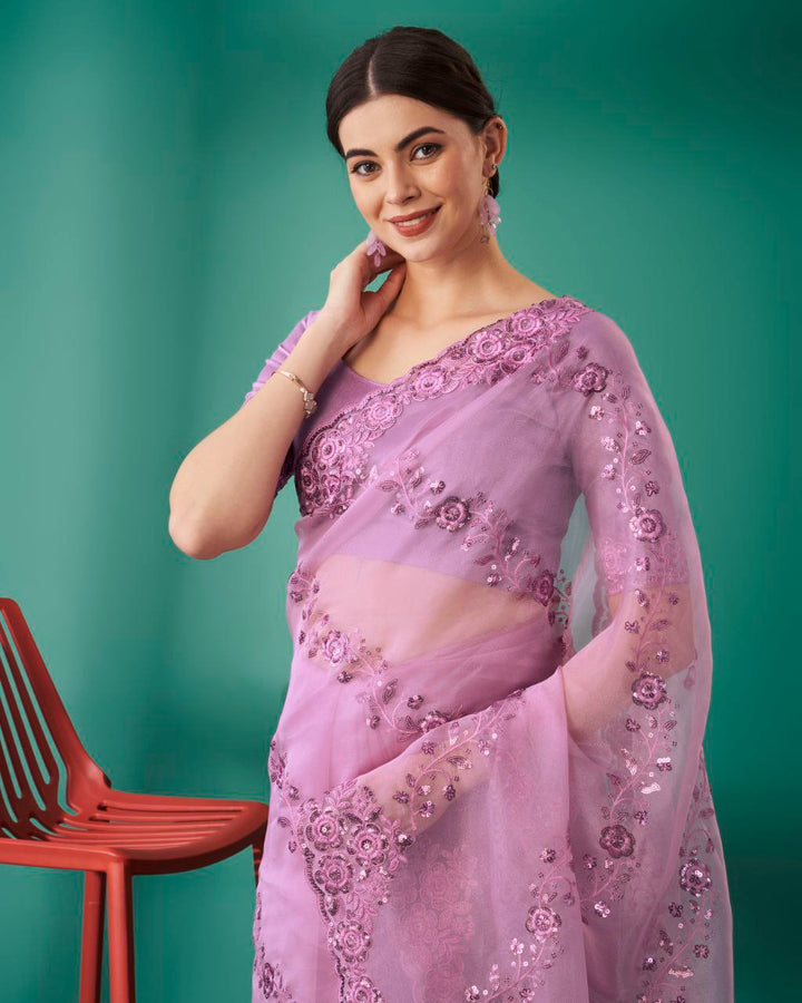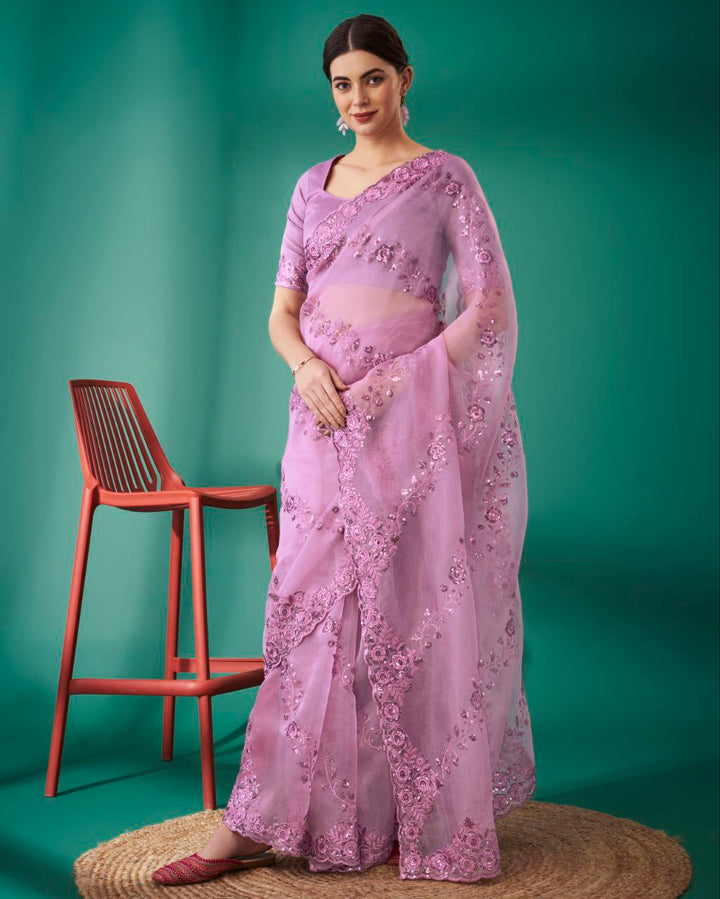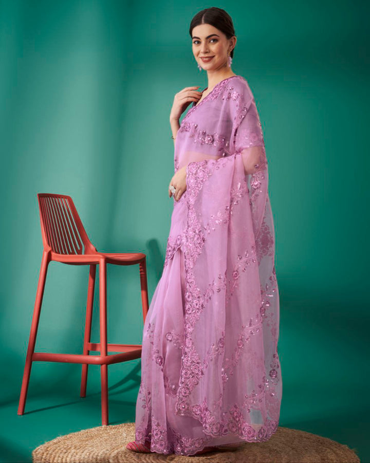 Violet Organza Silk Designer Saree with Embroidered Cutwork Border