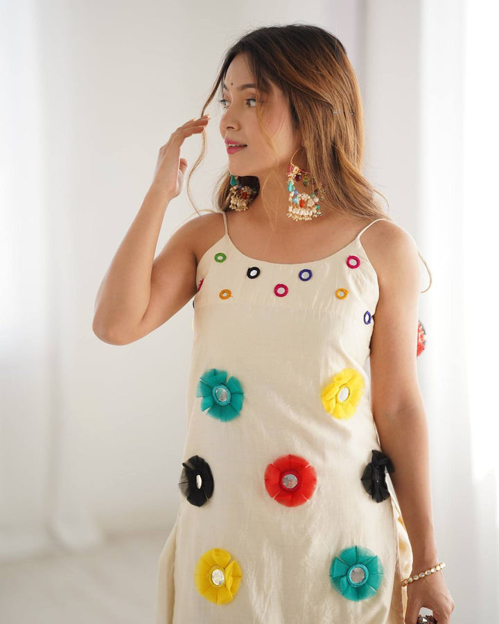 Elegant khadi cotton dhoti set featuring intricate mirror khatli work on the top. Designed for comfort and effortless ethnic charm, perfect for festive and casual occasions.