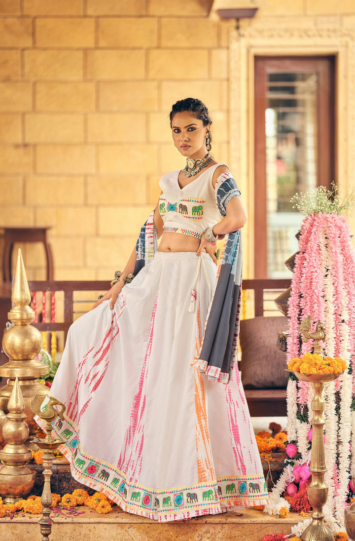 White Pure Cotton Shibori Print Lehenga Set with Embroidery