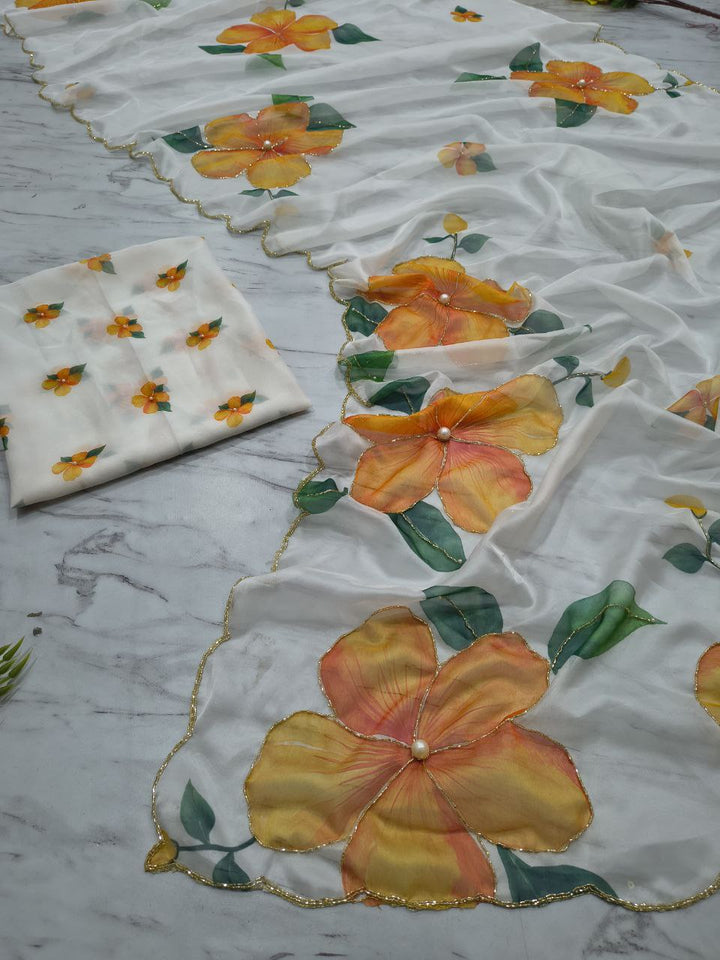 White Taby Silk Saree with Handwork Detailing