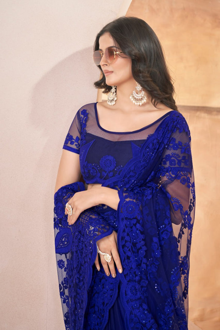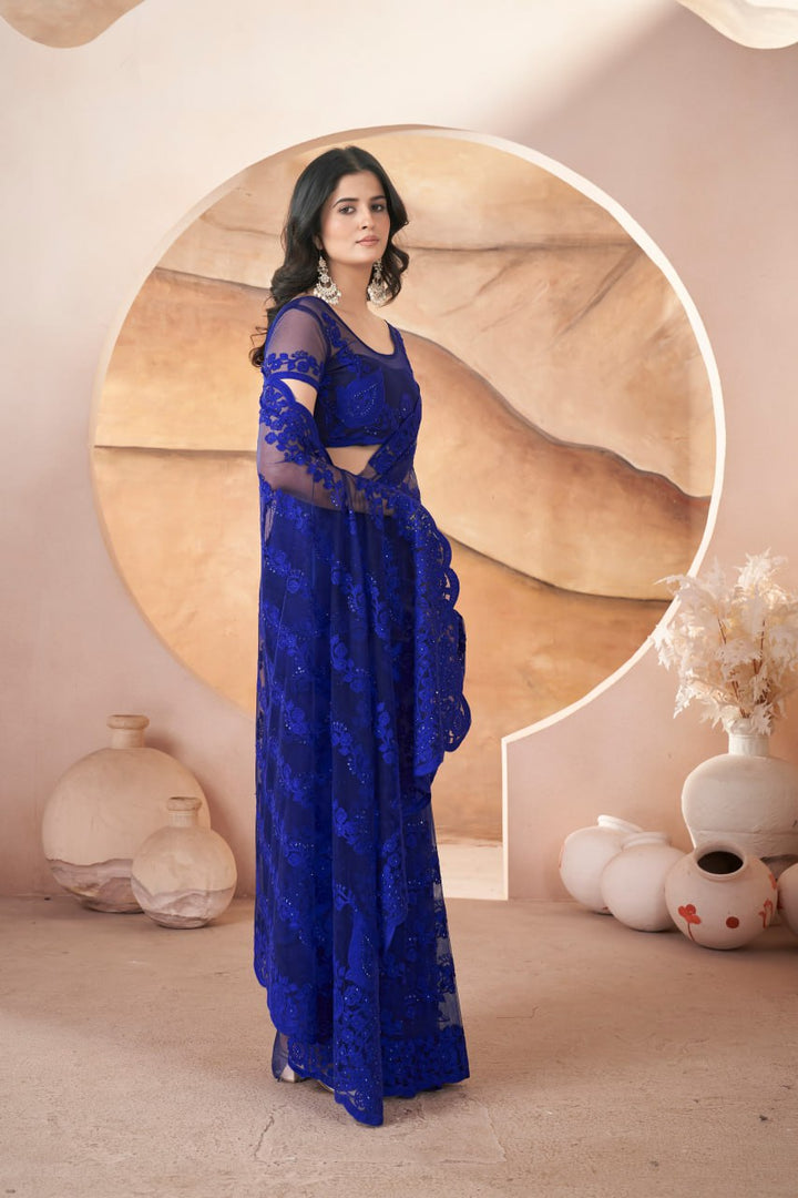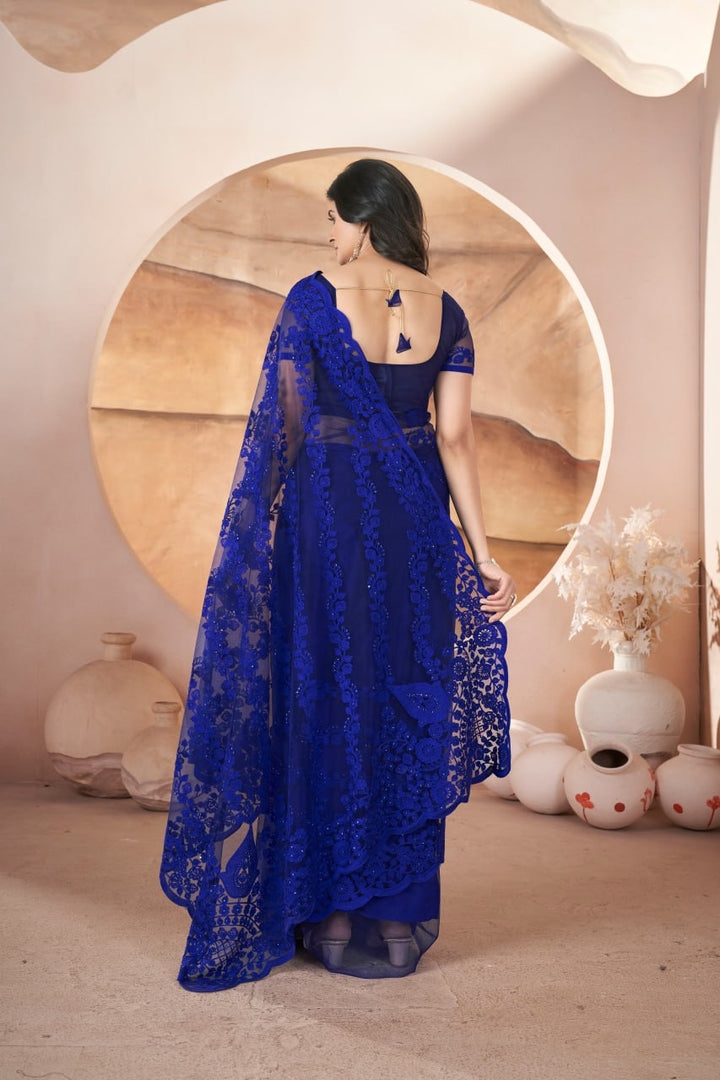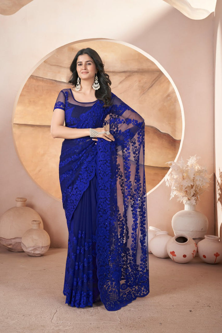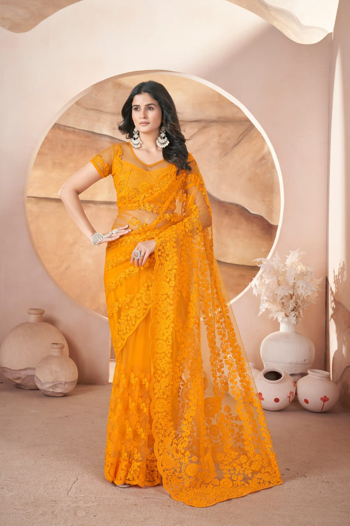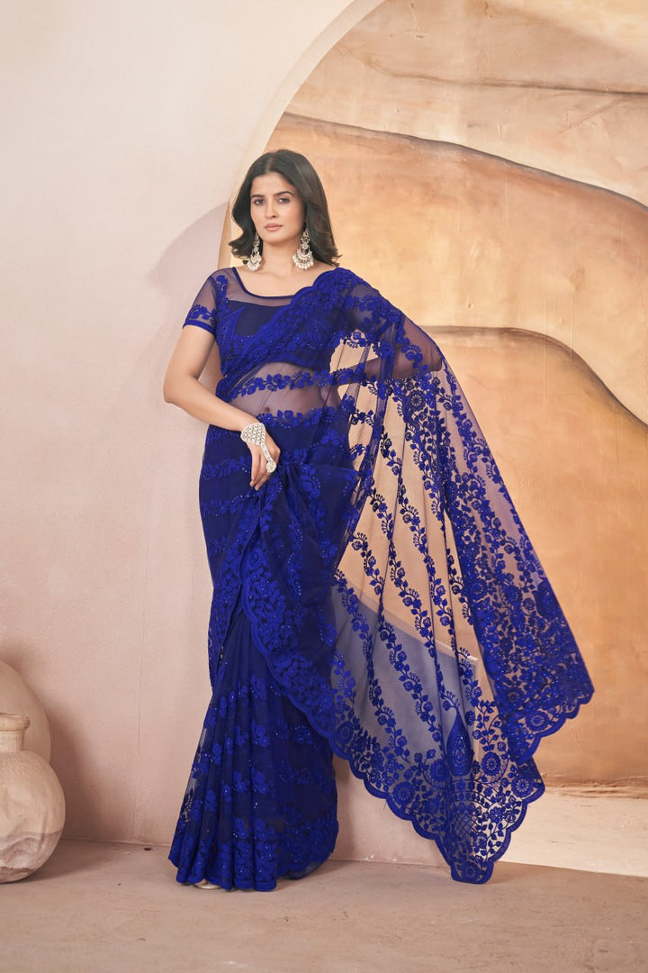 A luxurious Heavy Butterfly Net saree featuring tone-to-tone Aari embroidery, elegant stonework, and a beautifully designed rich pallu. Paired with a matching embroidered blouse fabric, this saree is available in four stunning colours—perfect for festive wear, parties, and grand occasions.
