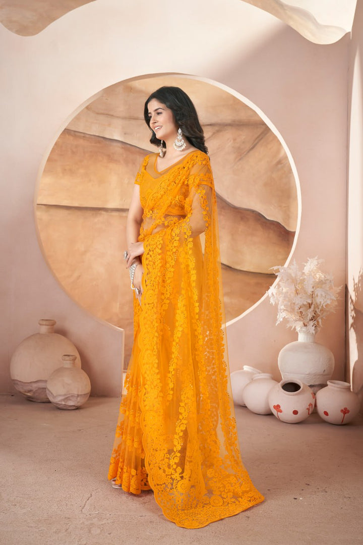 Yellow & Navy Blue Heavy Butterfly Net Aari Embroidered Saree